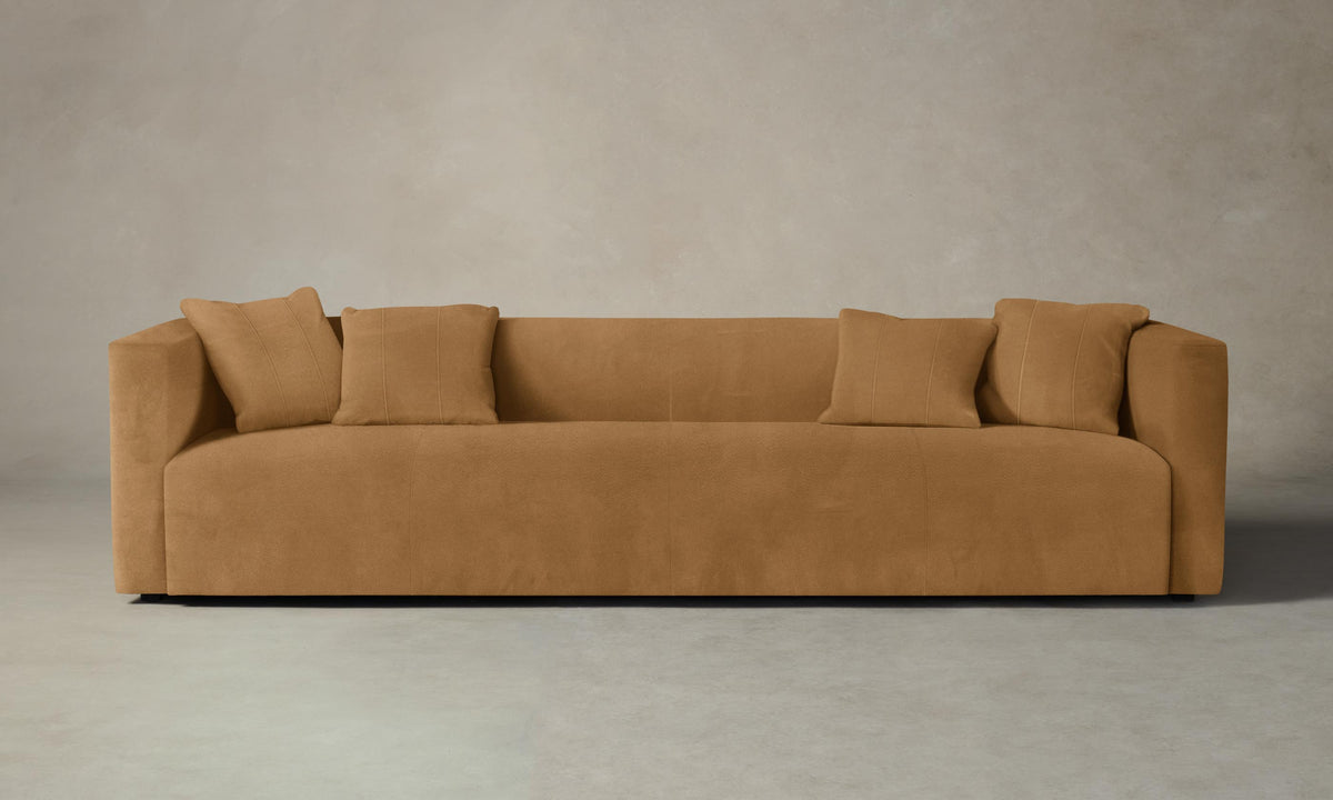 The Breuer Sofa draws inspiration from the bold and graphic shapes of brutalist design. Tightly upholstered for a sleek look, it has a low-lying seat accompanied by plush throw pillows. Handcrafted in North Carolina.