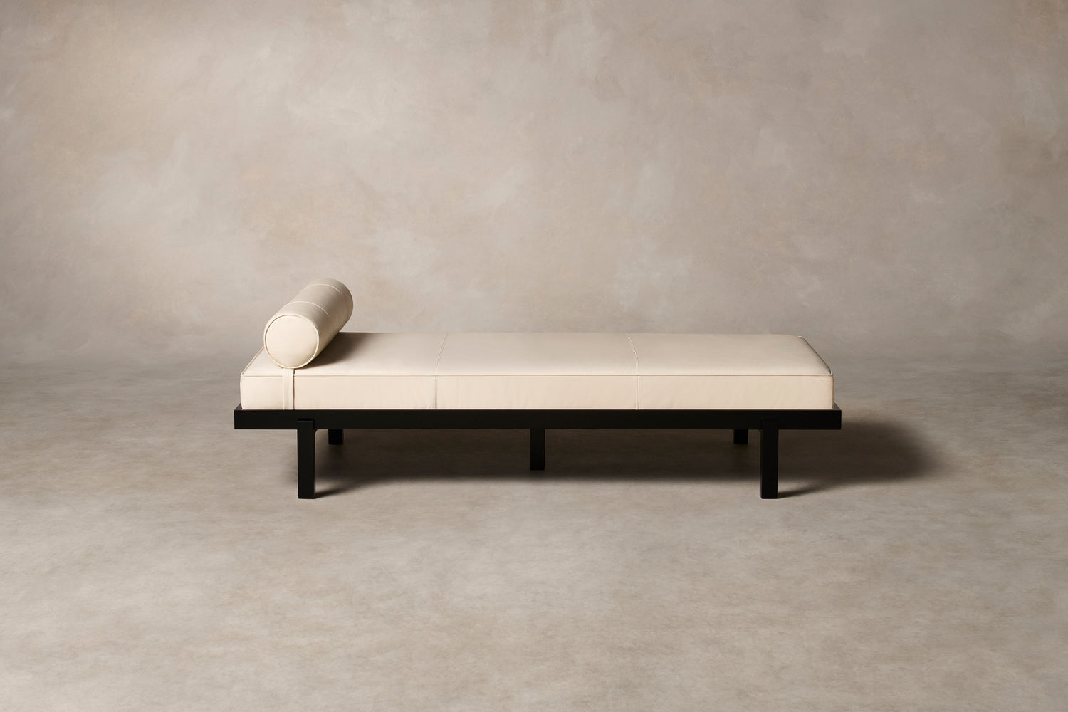 The Bruna Daybed stands out for its high-shine lacquer frame—a tribute to glossy designs of the Art Deco era. Its bench cushion is masterfully upholstered and accompanied by a bolster cushion with double-stitched accents.