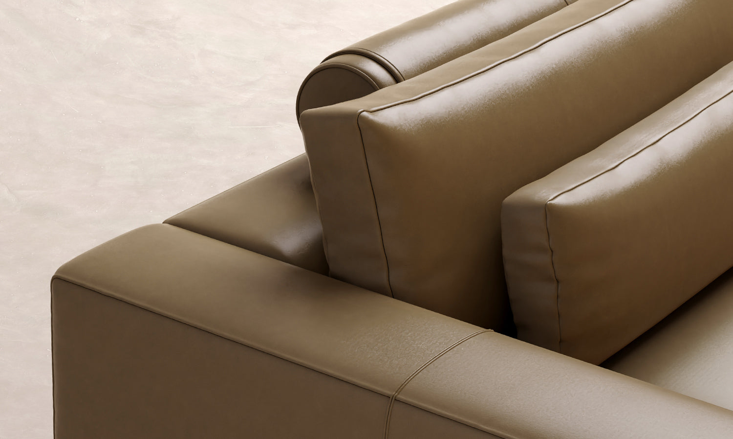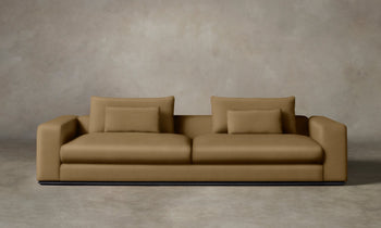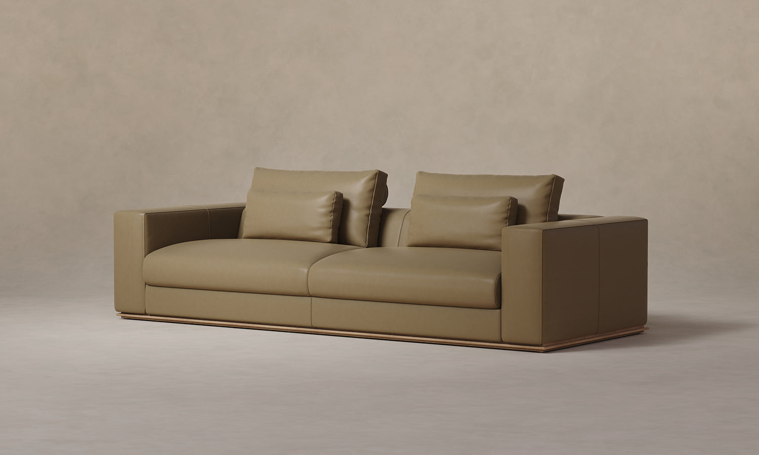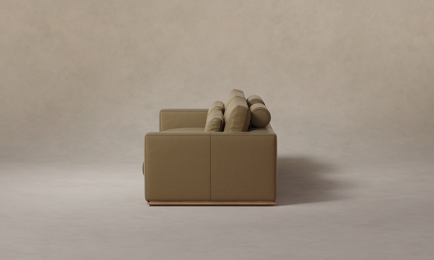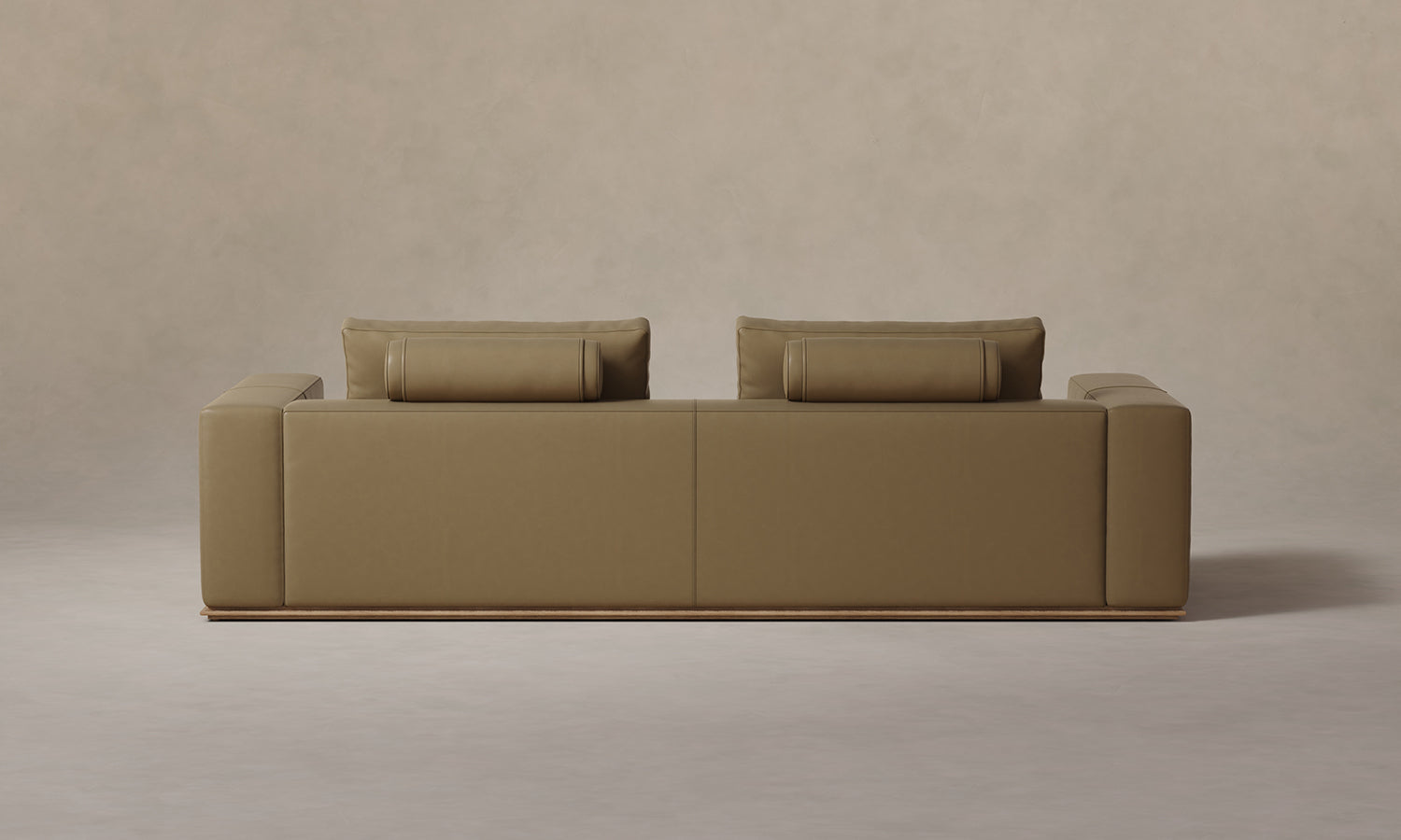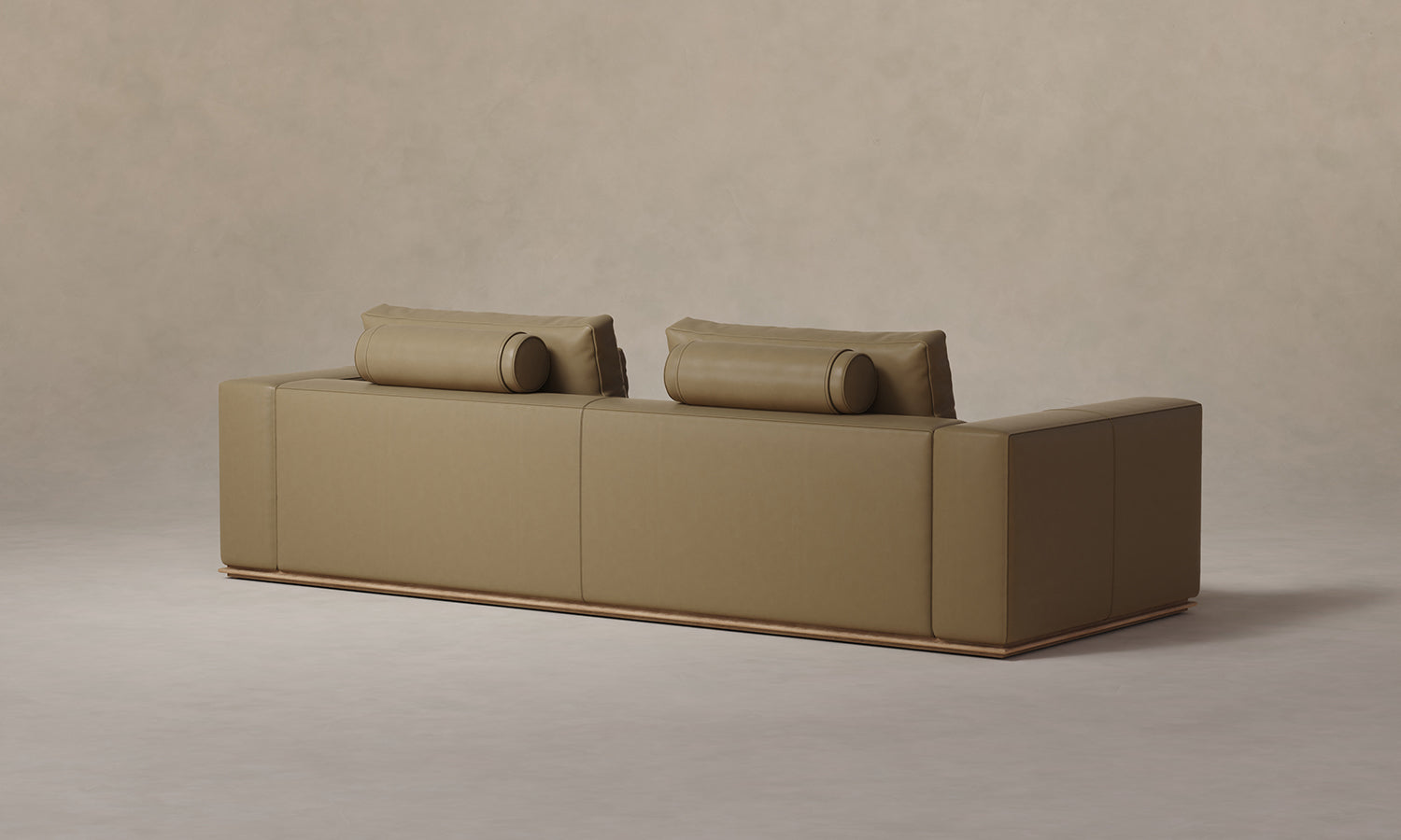 Marrying Italian modernist form with enveloping comfort, the Nicola Sofa invites total relaxation. It has a low back with plush down cushions supported by bolsters and rests atop a sleek plinth base. Handcrafted in North Carolina.