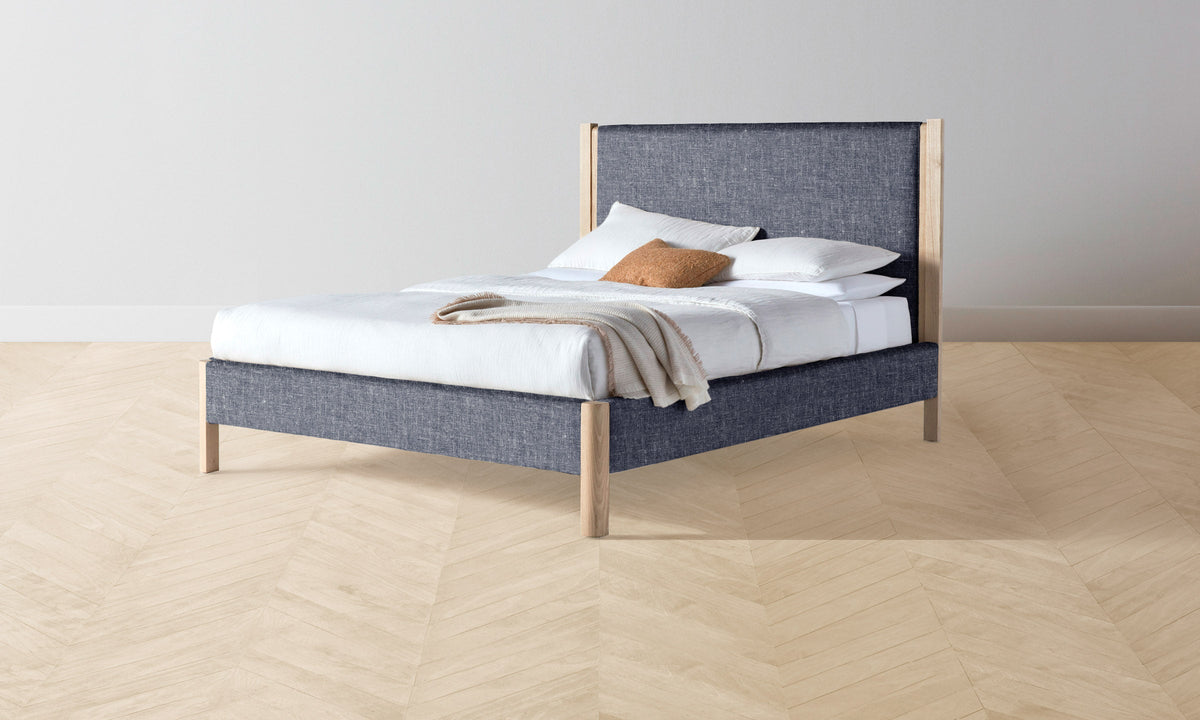 The Thompson Bed is an expression of graceful simplicity. It has an ash frame with rounded corners and neat upholstery along the headboard, foot rail, and sides, creating a perfect balance of rigidity and softness. Handcrafted in North Carolina.