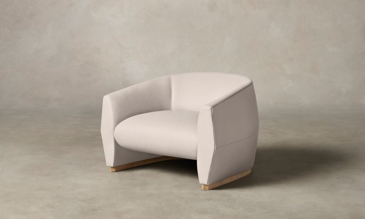 The Alpe Chair is a streamlined silhouette with convex wraparound arms that rest upon an elegant white oak or walnut base. The design is cloaked in masterful upholstery with sleek linear seams. Handcrafted in North Carolina.