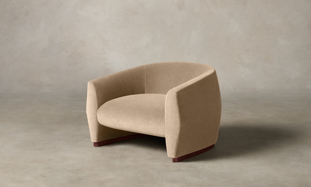 The Alpe Chair is a streamlined silhouette with convex wraparound arms that rest upon an elegant white oak or walnut base. The design is cloaked in masterful upholstery with sleek linear seams. Handcrafted in North Carolina.