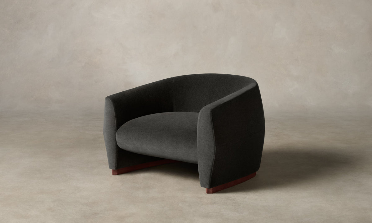 The Alpe Chair is a streamlined silhouette with convex wraparound arms that rest upon an elegant white oak or walnut base. The design is cloaked in masterful upholstery with sleek linear seams. Handcrafted in North Carolina.