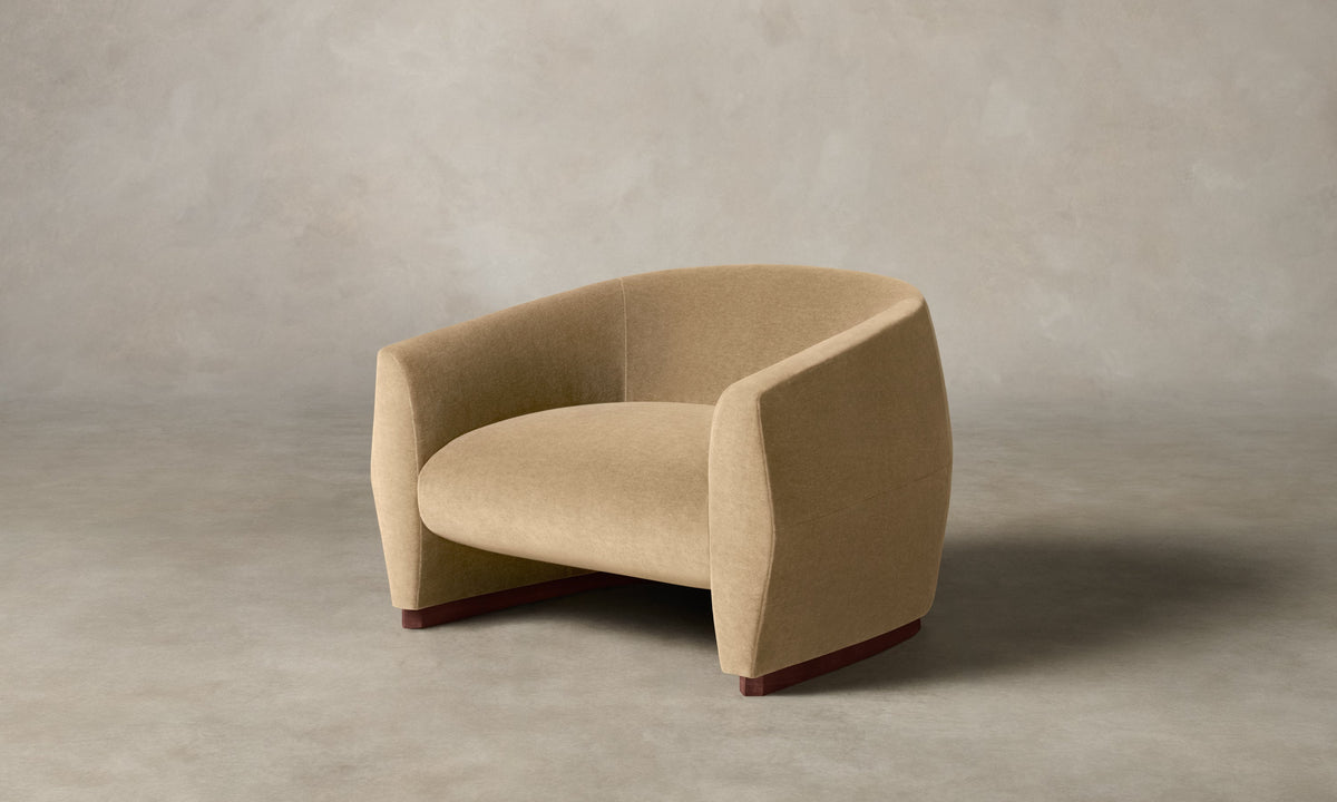 The Alpe Chair is a streamlined silhouette with convex wraparound arms that rest upon an elegant white oak or walnut base. The design is cloaked in masterful upholstery with sleek linear seams. Handcrafted in North Carolina.