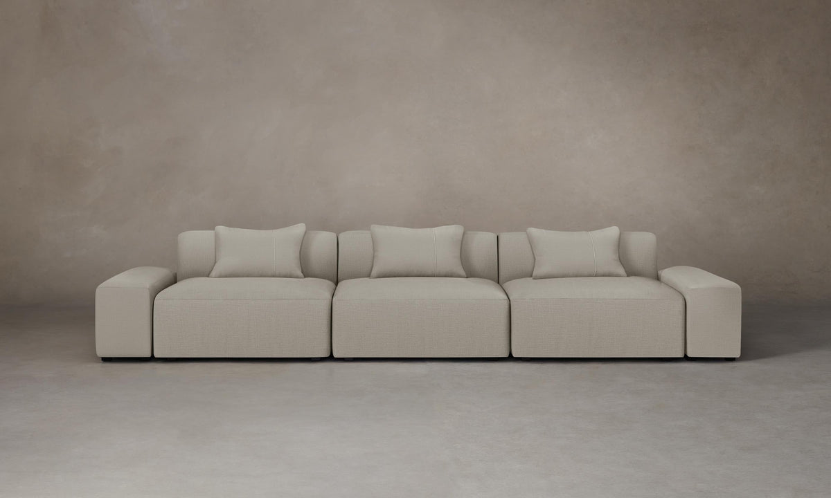 The Breuer Modular Sofa draws inspiration from the bold and graphic shapes of brutalist design. Tightly upholstered for a sleek look, it has a low-lying seat accompanied by plush throw pillows. Handcrafted in North Carolina.