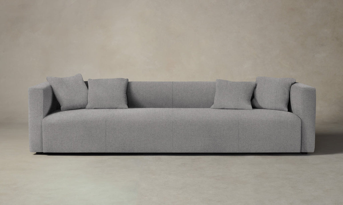 The Breuer Sofa draws inspiration from the bold and graphic shapes of brutalist design. Tightly upholstered for a sleek look, it has a low-lying seat accompanied by plush throw pillows. Handcrafted in North Carolina.
