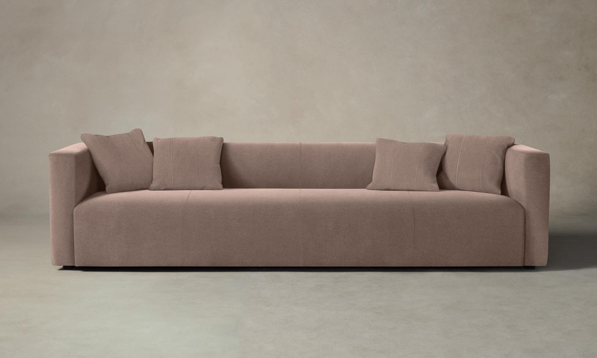 The Breuer Sofa draws inspiration from the bold and graphic shapes of brutalist design. Tightly upholstered for a sleek look, it has a low-lying seat accompanied by plush throw pillows. Handcrafted in North Carolina.