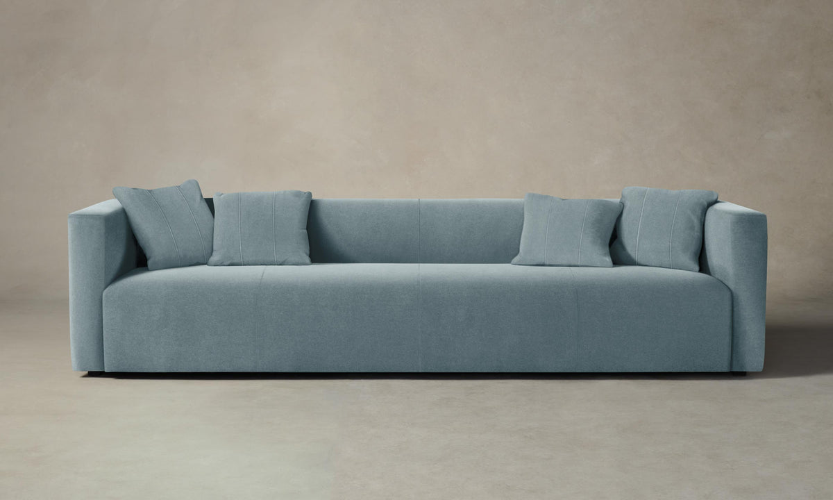 The Breuer Sofa draws inspiration from the bold and graphic shapes of brutalist design. Tightly upholstered for a sleek look, it has a low-lying seat accompanied by plush throw pillows. Handcrafted in North Carolina.