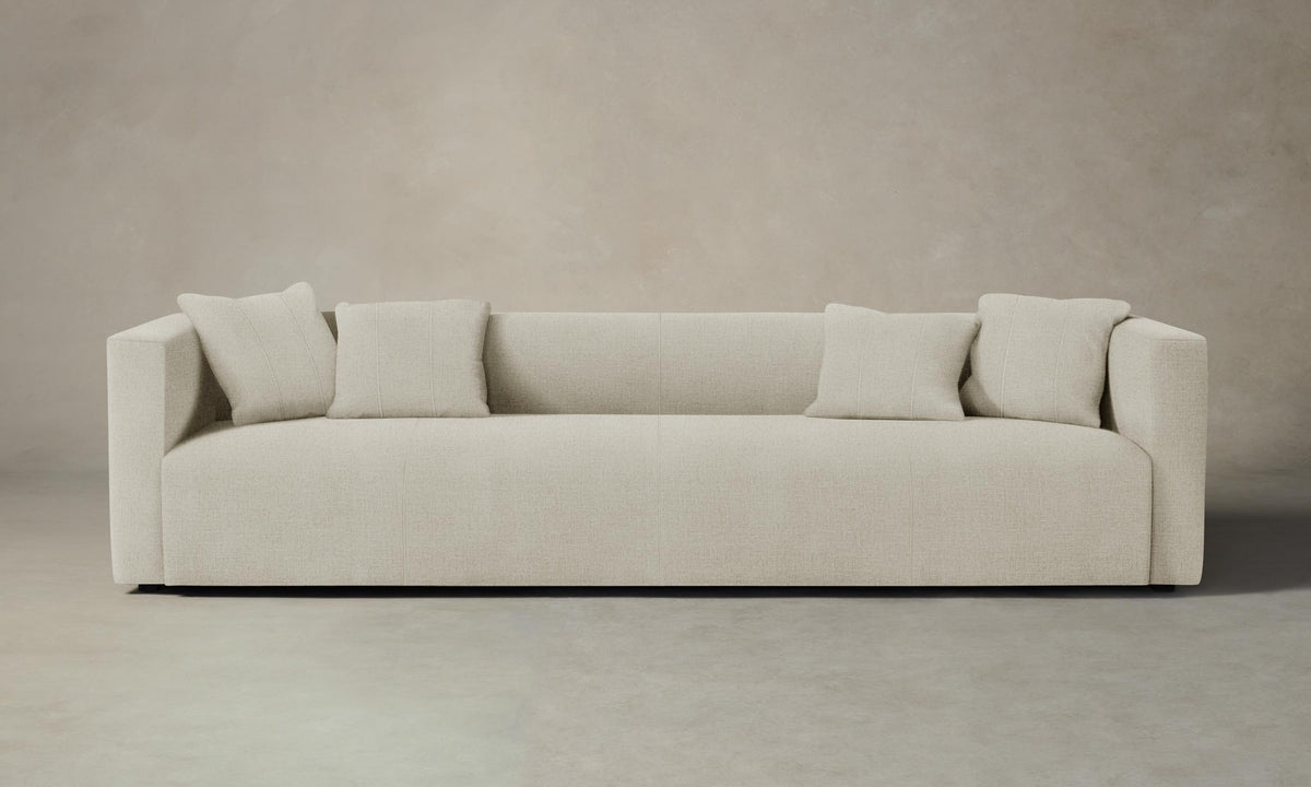 The Breuer Sofa draws inspiration from the bold and graphic shapes of brutalist design. Tightly upholstered for a sleek look, it has a low-lying seat accompanied by plush throw pillows. Handcrafted in North Carolina.