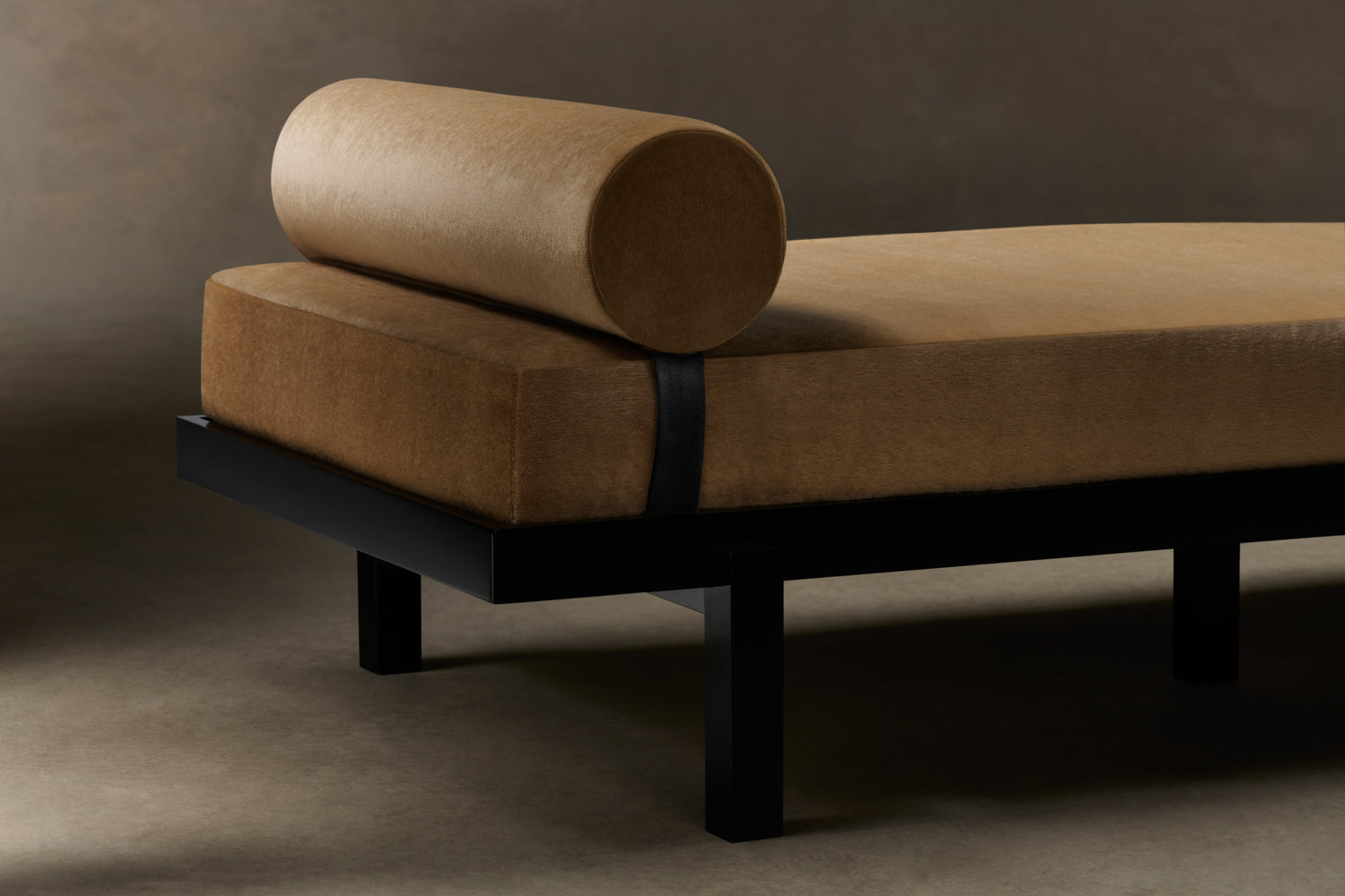 The Bruna Daybed stands out for its high-shine lacquer frame—a tribute to glossy designs of the Art Deco era. Its bench cushion is masterfully upholstered and accompanied by a bolster cushion with double-stitched accents.