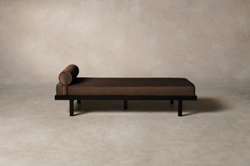 The Bruna Daybed stands out for its high-shine lacquer frame—a tribute to glossy designs of the Art Deco era. Its bench cushion is masterfully upholstered and accompanied by a bolster cushion with double-stitched accents.