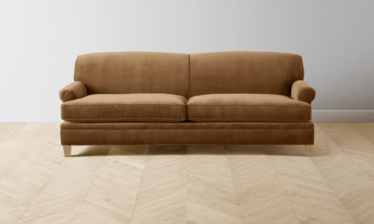 Neatly tailored and detailed with fan-pleated arms, the Carmine Sofa casts an air of elegance upon your space. It sits on tapered wood legs that round out the design’s polished appeal. Handcrafted in North Carolina.