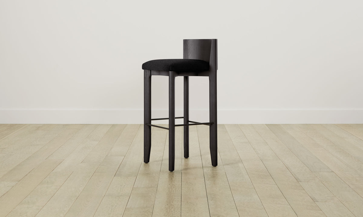 The Delancey Bar & Counter Stool brings depth and dimension into your space with its mixed materiality. Made from ash, it has an elegantly curved back, upholstered seat, and metal footrest. Handcrafted in North Carolina.