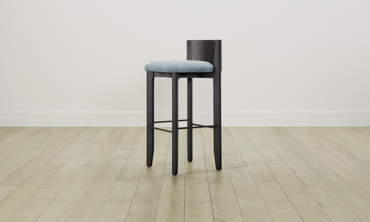 The Delancey Bar & Counter Stool brings depth and dimension into your space with its mixed materiality. Made from ash, it has an elegantly curved back, upholstered seat, and metal footrest. Handcrafted in North Carolina.
