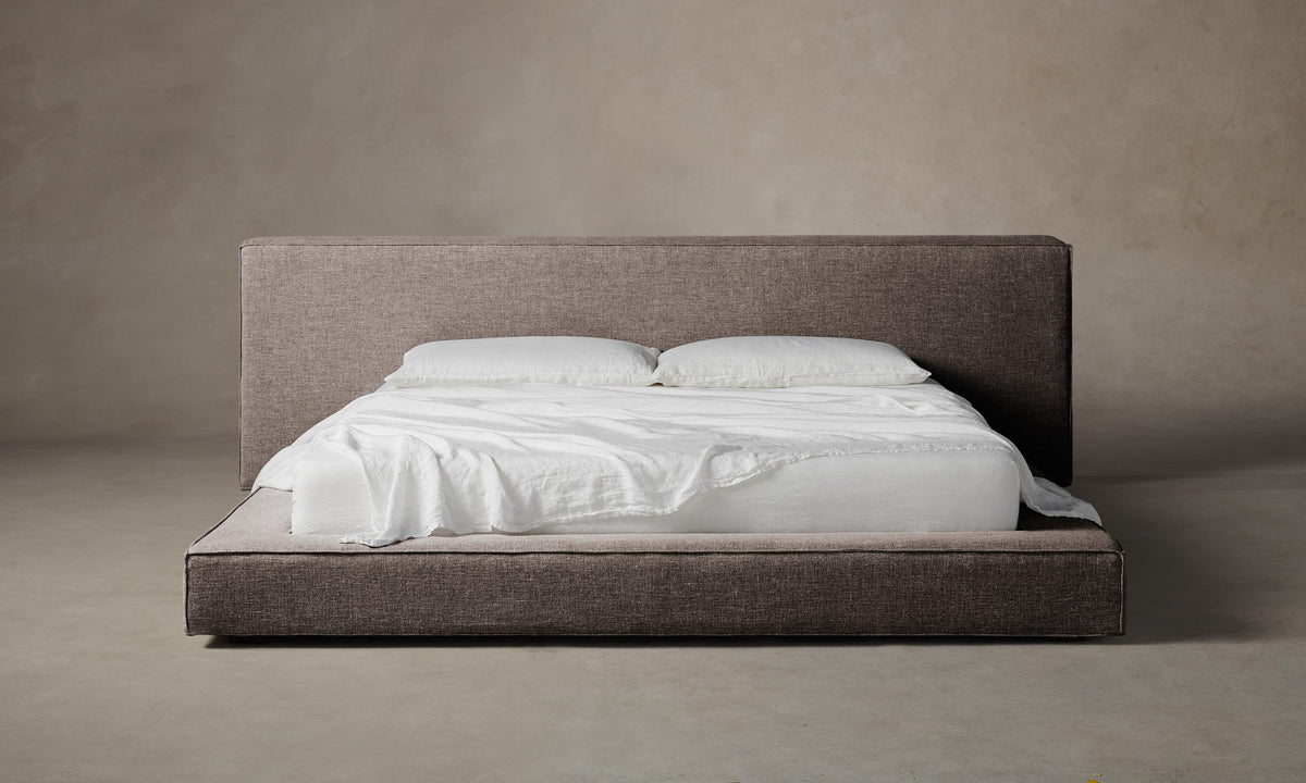 The Eldridge Bed establishes a laid-back ambience in the bedroom with its low-lying silhouette and generous proportions. Fully upholstered and cushioned all around, it has an extended headboard and linear form traced with flange seams. Handcrafted in North Carolina.