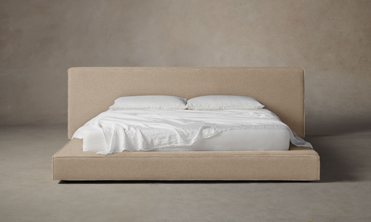 The Eldridge Bed establishes a laid-back ambience in the bedroom with its low-lying silhouette and generous proportions. Fully upholstered and cushioned all around, it has an extended headboard and linear form traced with flange seams. Handcrafted in North Carolina.