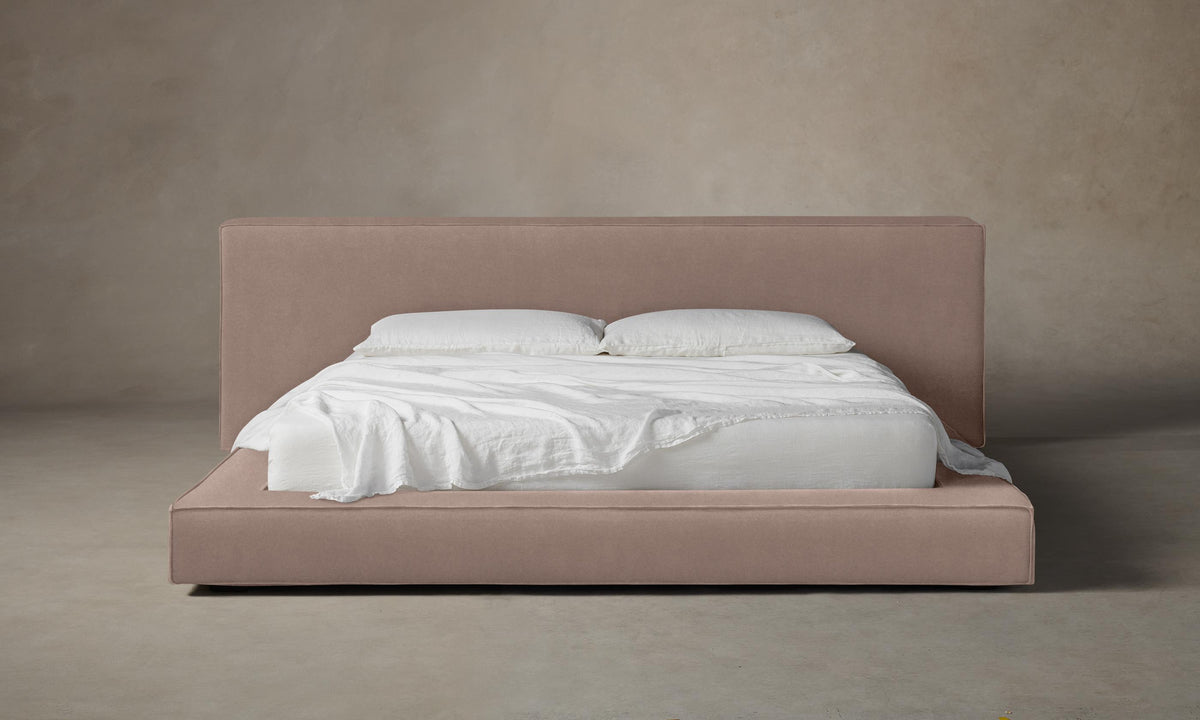 The Eldridge Bed establishes a laid-back ambience in the bedroom with its low-lying silhouette and generous proportions. Fully upholstered and cushioned all around, it has an extended headboard and linear form traced with flange seams. Handcrafted in North Carolina.