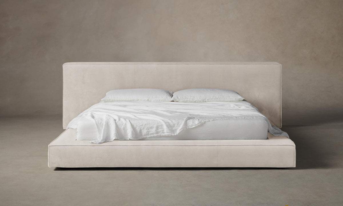 The Eldridge Bed establishes a laid-back ambience in the bedroom with its low-lying silhouette and generous proportions. Fully upholstered and cushioned all around, it has an extended headboard and linear form traced with flange seams. Handcrafted in North Carolina.