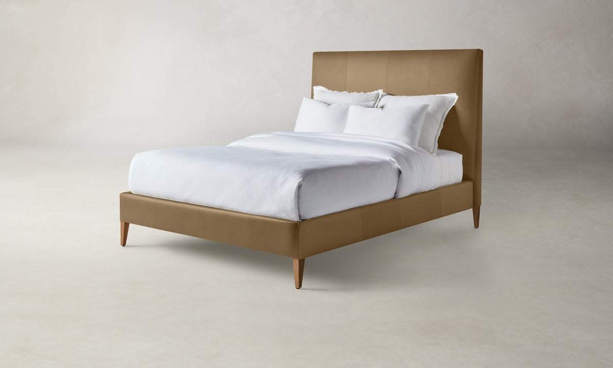 With its clean lines and neat tailoring, the Essex Bed is timeless in the truest sense. It has a fully upholstered frame with mitered corners and rests upon elegantly tapered legs. Handcrafted in North Carolina.