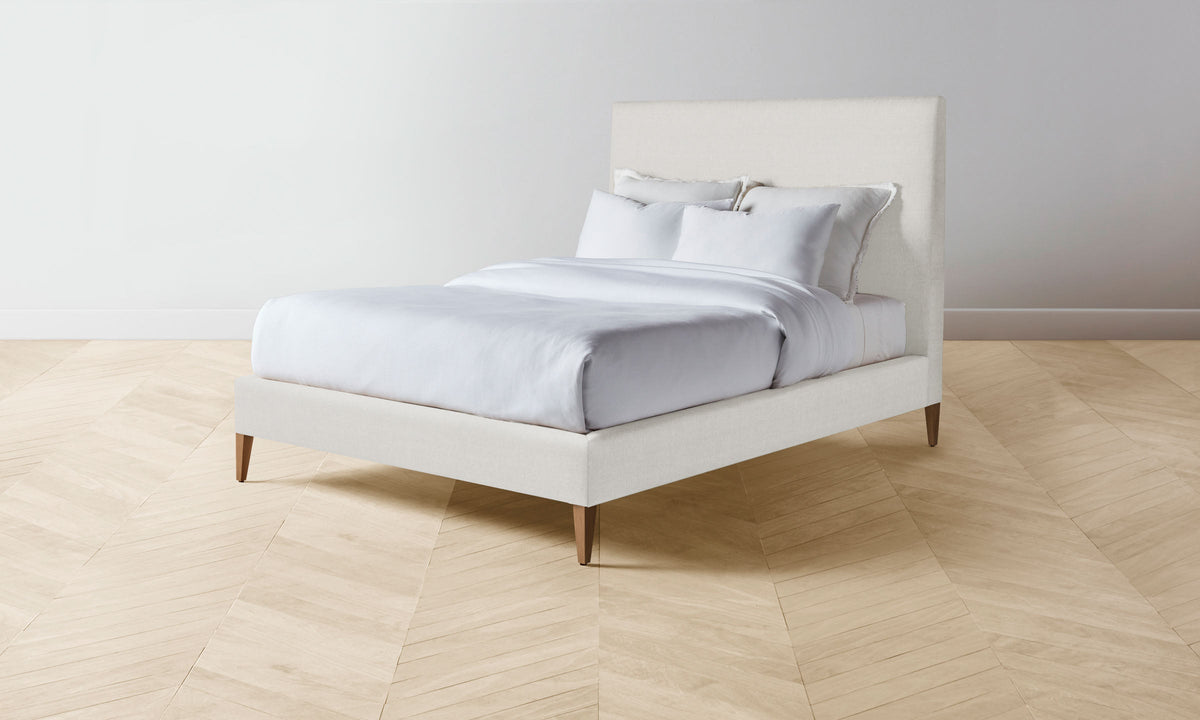 With its clean lines and neat tailoring, the Essex Bed is timeless in the truest sense. It has a fully upholstered frame with mitered corners and rests upon elegantly tapered legs. Handcrafted in North Carolina.