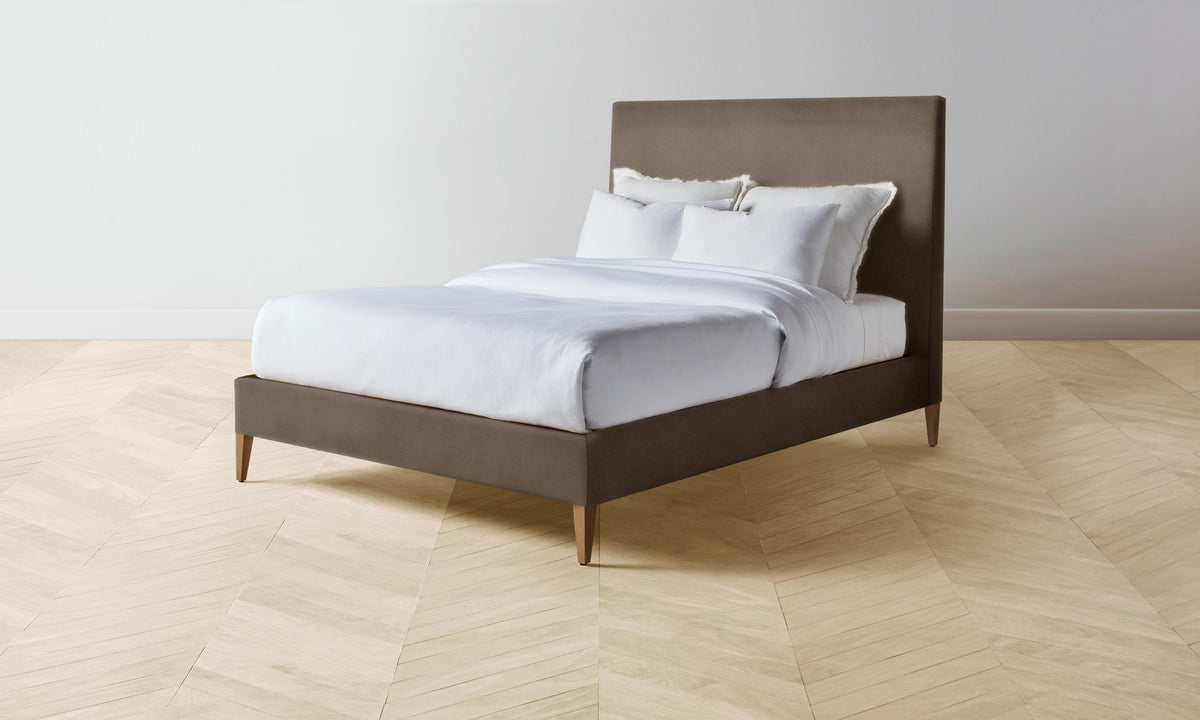With its clean lines and neat tailoring, the Essex Bed is timeless in the truest sense. It has a fully upholstered frame with mitered corners and rests upon elegantly tapered legs. Handcrafted in North Carolina.