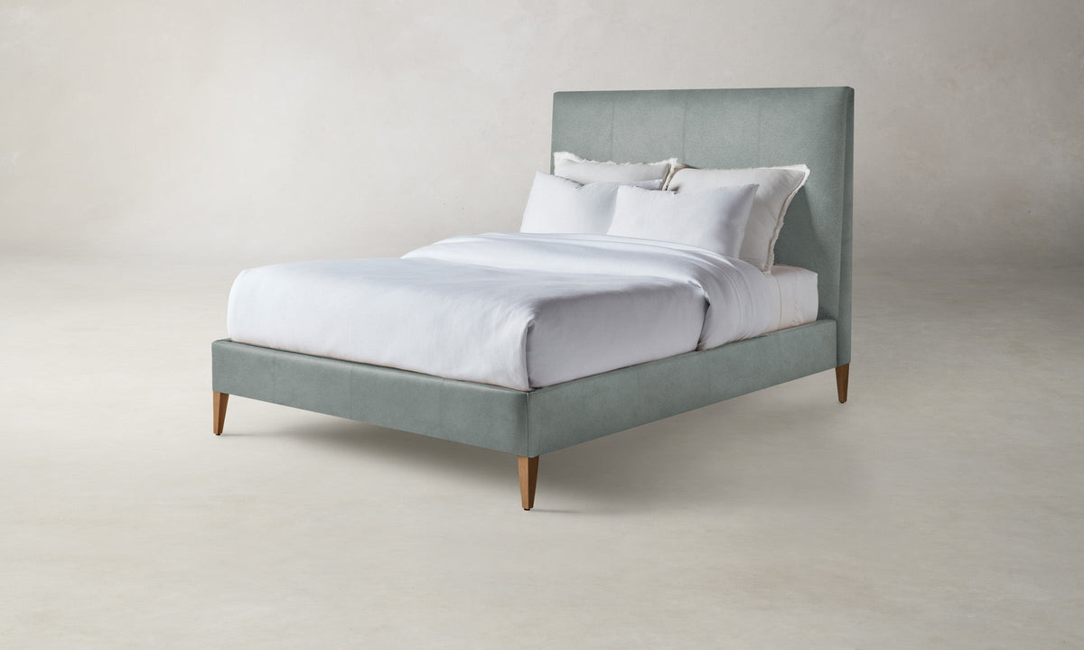 With its clean lines and neat tailoring, the Essex Bed is timeless in the truest sense. It has a fully upholstered frame with mitered corners and rests upon elegantly tapered legs. Handcrafted in North Carolina.