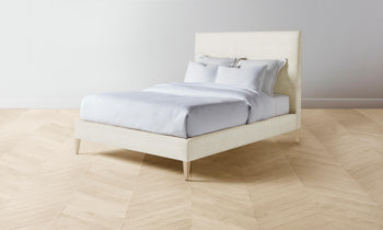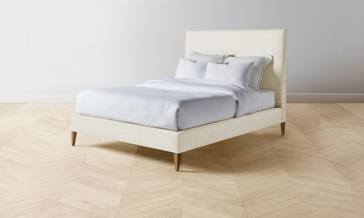 With its clean lines and neat tailoring, the Essex Bed is timeless in the truest sense. It has a fully upholstered frame with mitered corners and rests upon elegantly tapered legs. Handcrafted in North Carolina.
