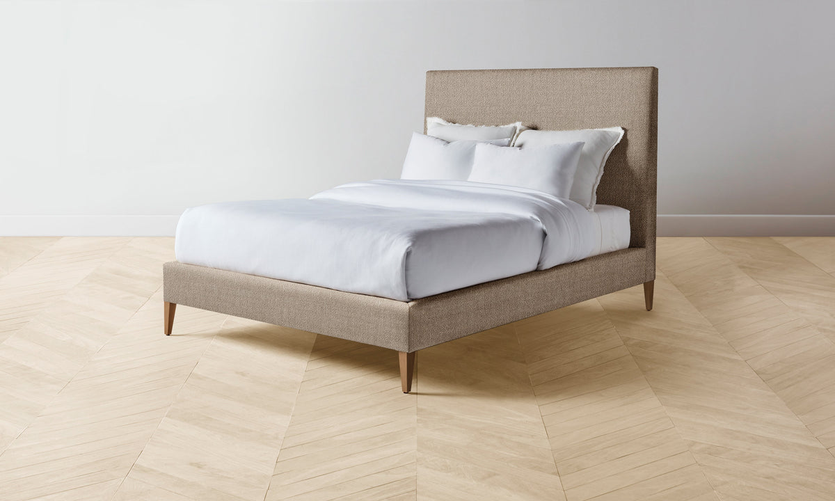 With its clean lines and neat tailoring, the Essex Bed is timeless in the truest sense. It has a fully upholstered frame with mitered corners and rests upon elegantly tapered legs. Handcrafted in North Carolina.