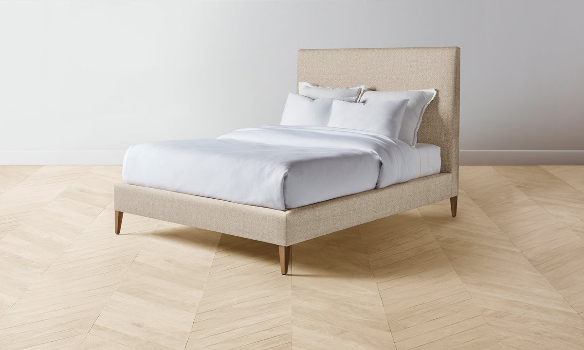 With its clean lines and neat tailoring, the Essex Bed is timeless in the truest sense. It has a fully upholstered frame with mitered corners and rests upon elegantly tapered legs. Handcrafted in North Carolina.