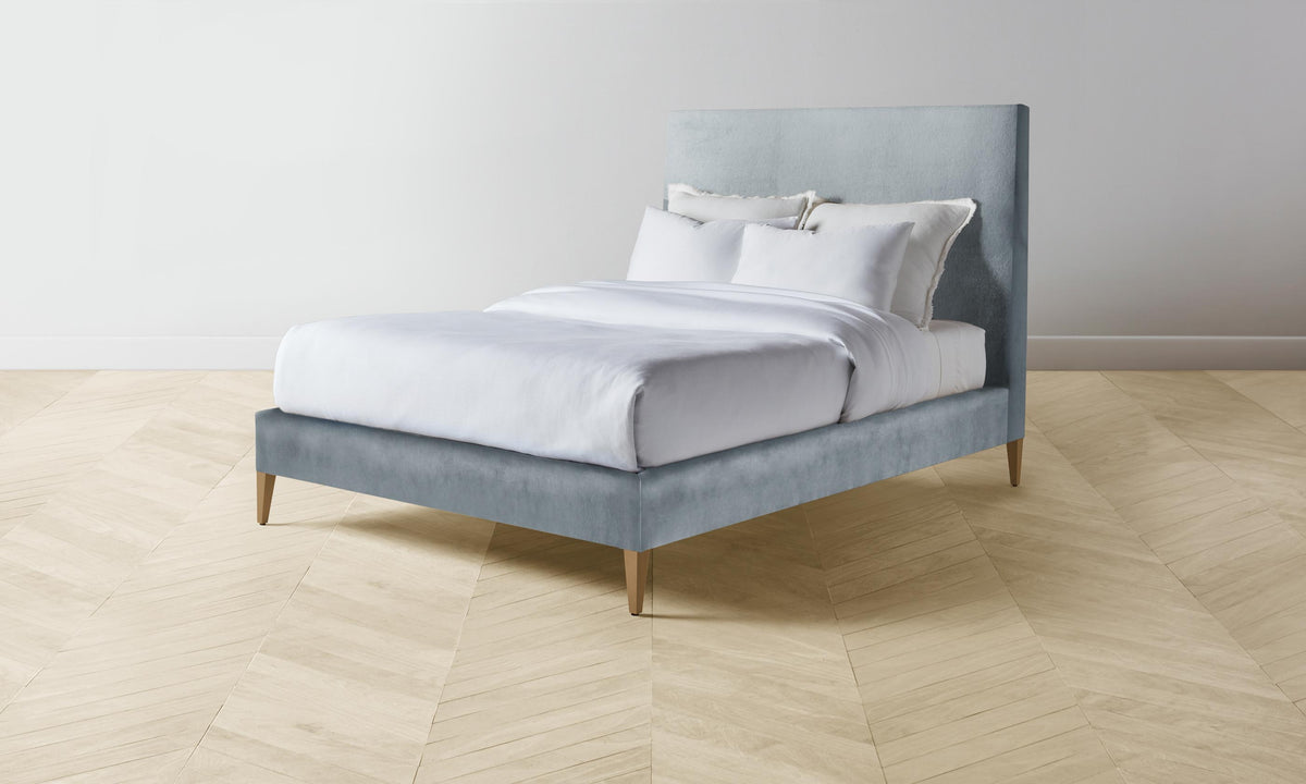 With its clean lines and neat tailoring, the Essex Bed is timeless in the truest sense. It has a fully upholstered frame with mitered corners and rests upon elegantly tapered legs. Handcrafted in North Carolina.