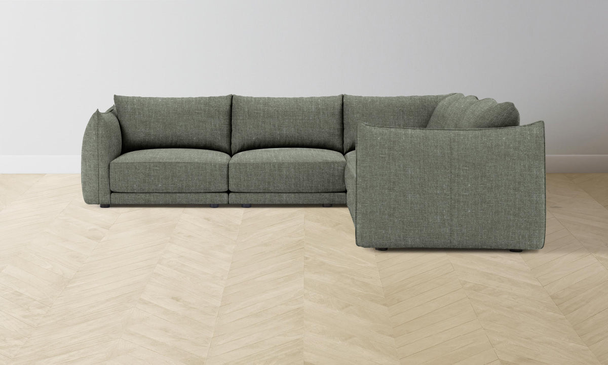 The Jones Sectional's low-lying, modular design recalls silhouettes from the 1970s. It has voluminous cushions and plush arms complete with flange seams for a tailored finish. Handcrafted in North Carolina.