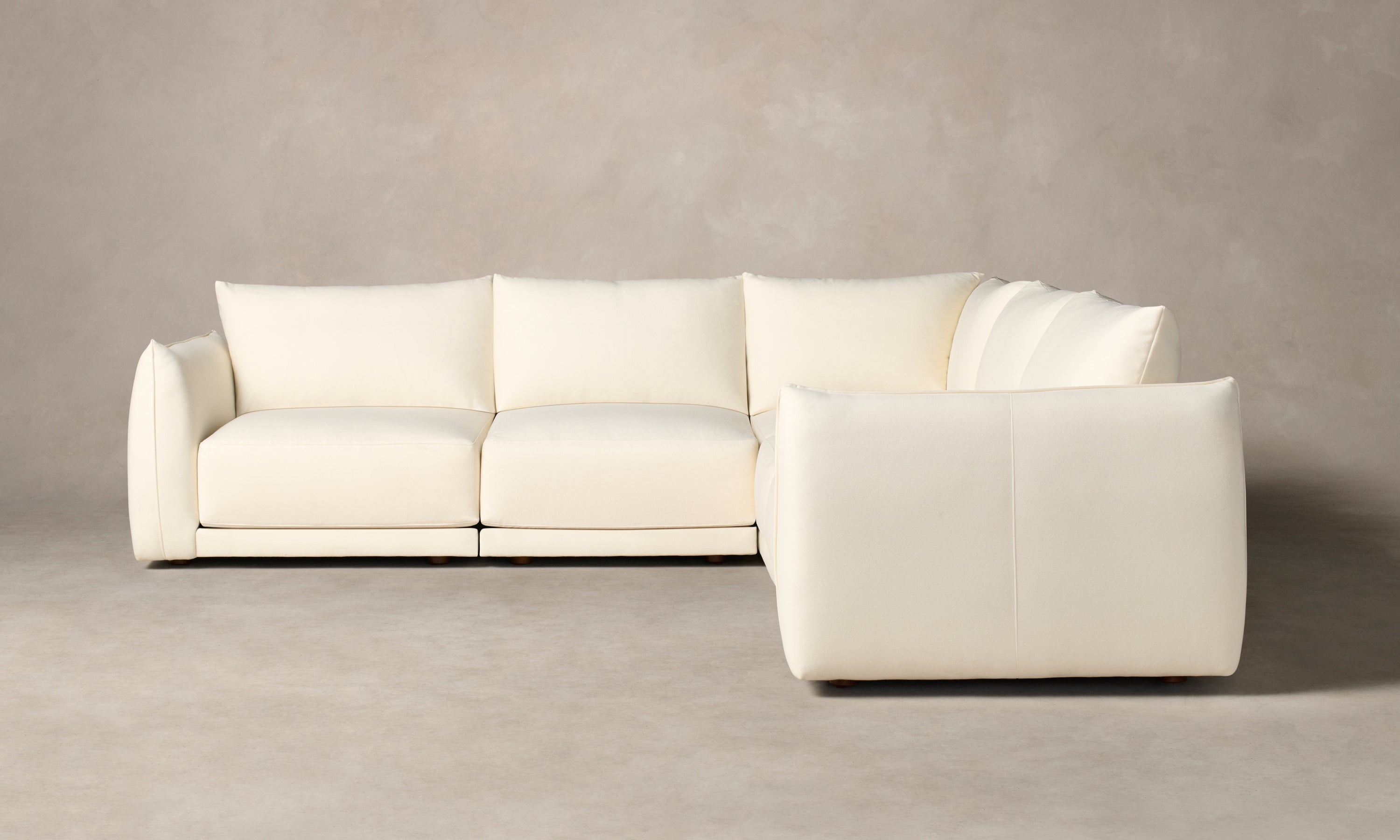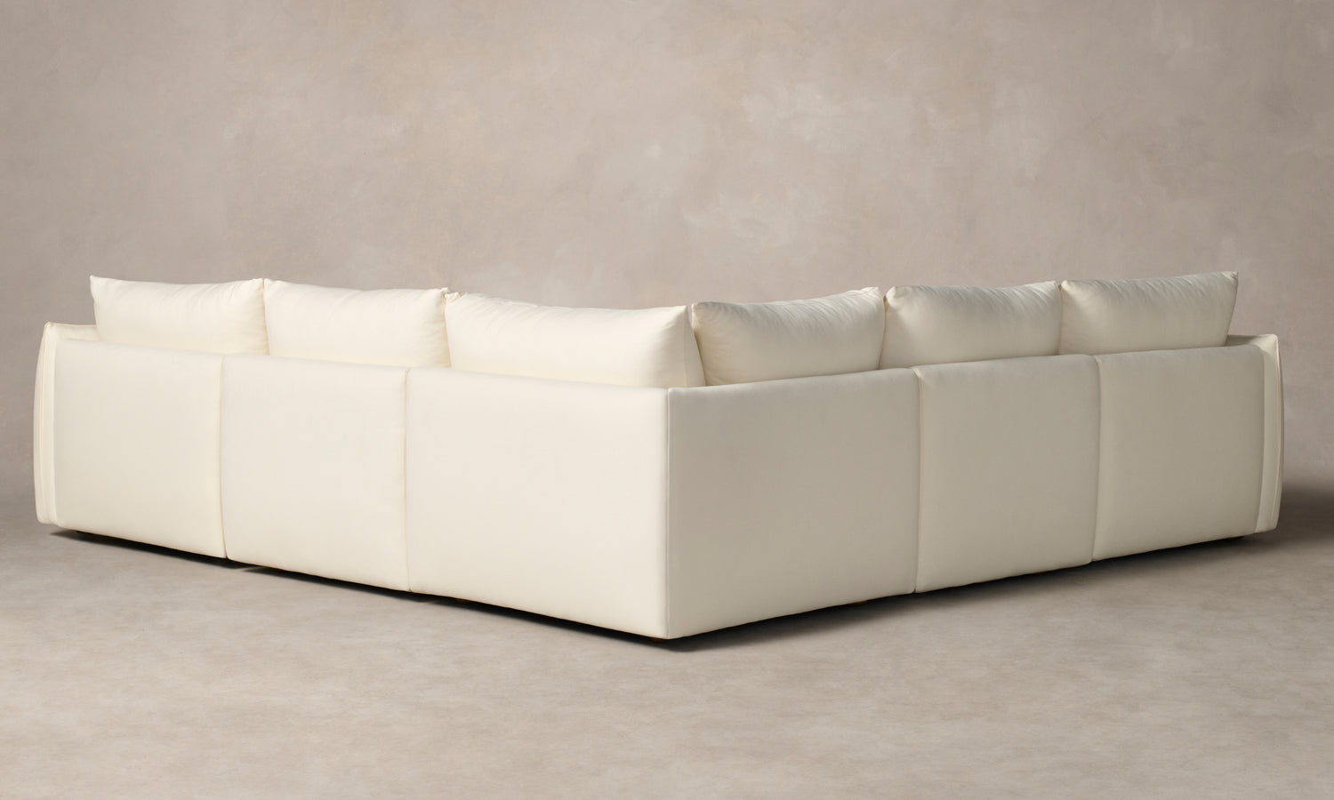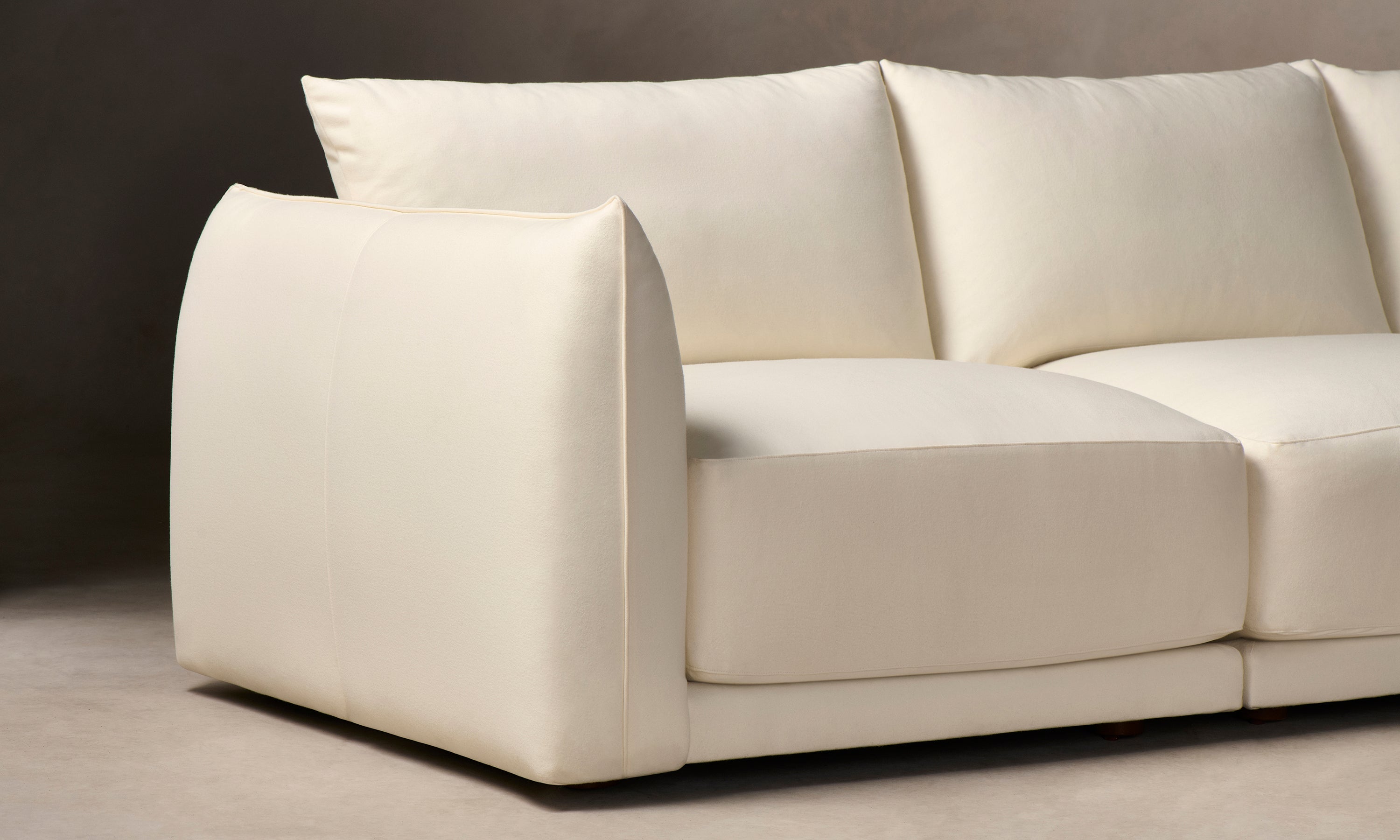 The Jones Sectional's low-lying, modular design recalls silhouettes from the 1970s. It has voluminous cushions and plush arms complete with flange seams for a tailored finish. Handcrafted in North Carolina.