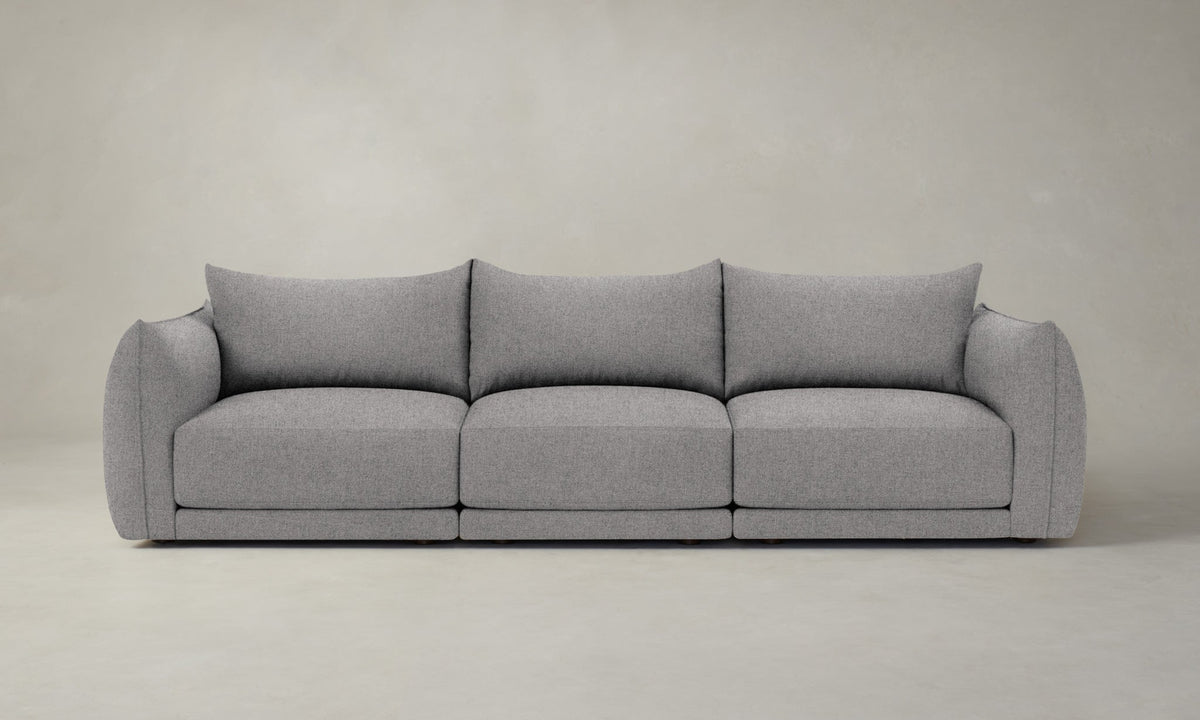 The Jones Sofa's low-lying, modular design recalls silhouettes from the 1970s. It has voluminous cushions and plush arms complete with flange seams for a tailored finish. Handcrafted in North Carolina.
