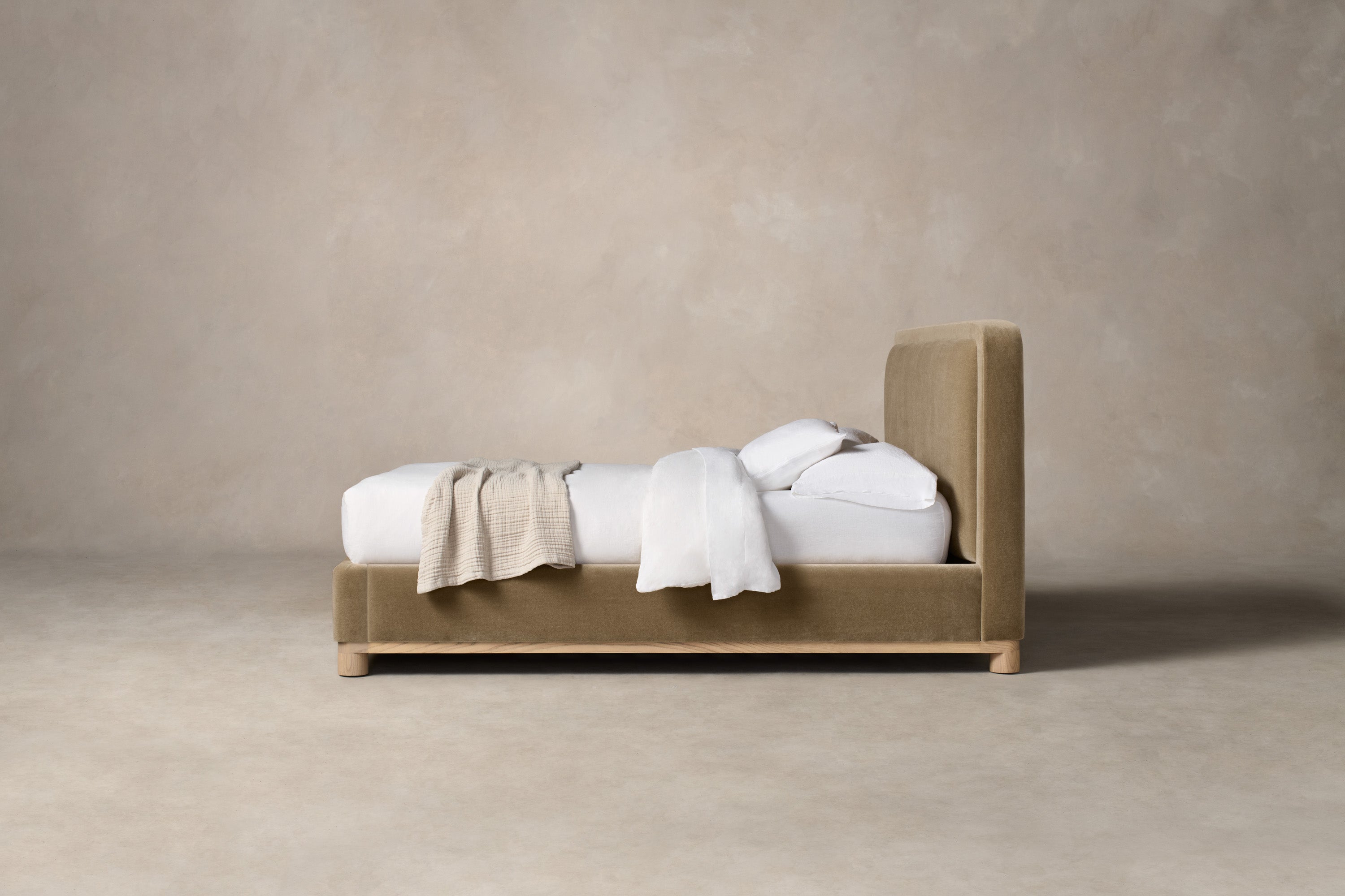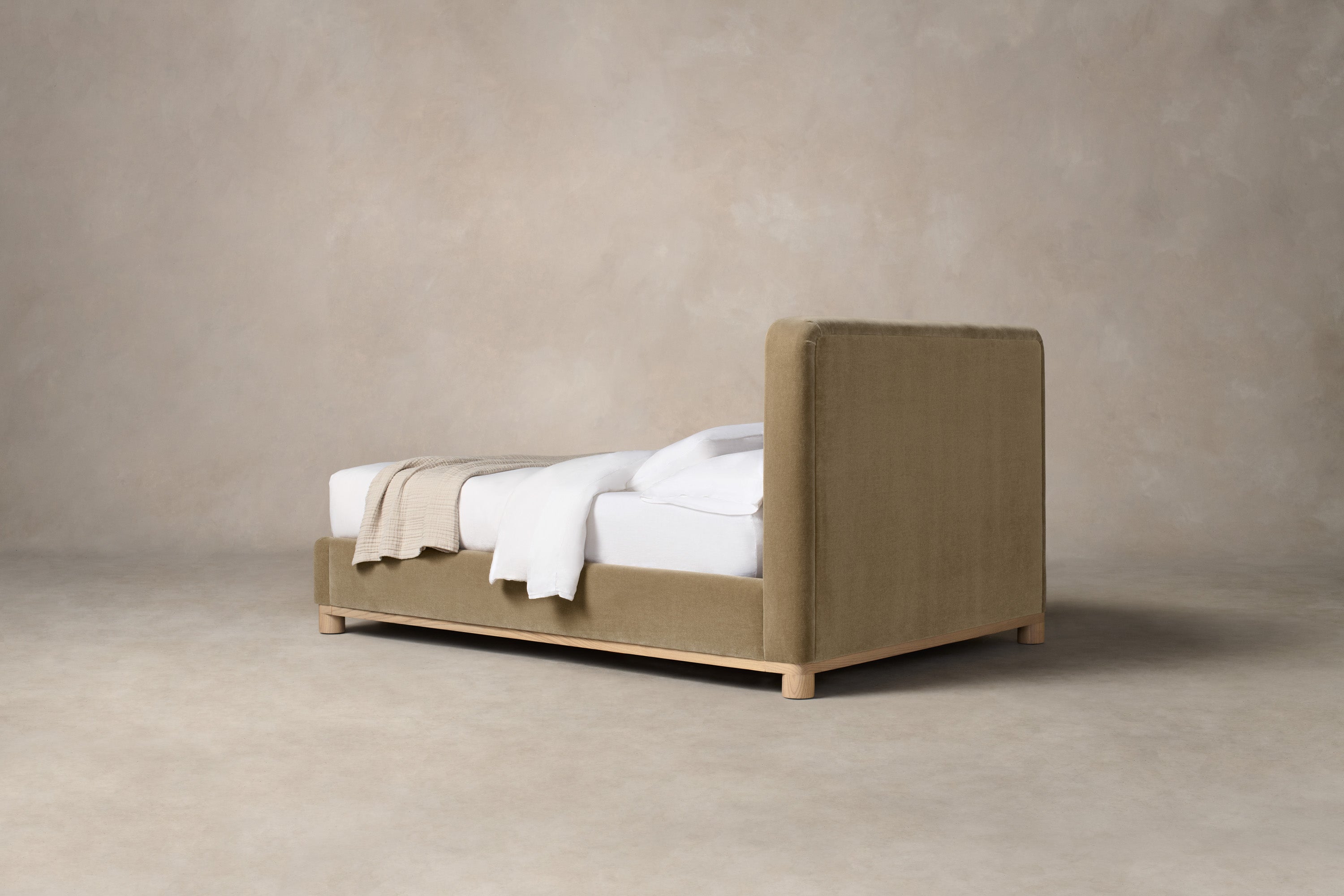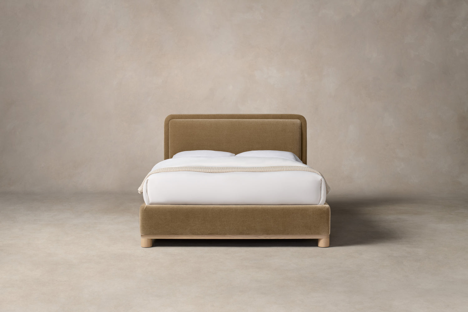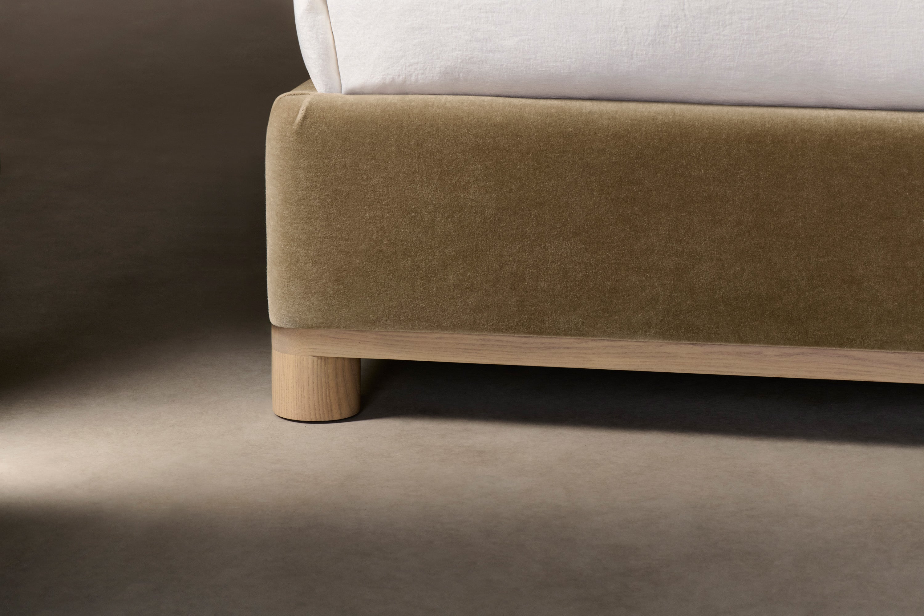 The Kent Bed’s rounded geometries create a sense of softness and tranquility. The design is tightly upholstered to emphasize its curved corners and foot rail, and it sits atop a plinth base with lathe-turned legs. Handcrafted in North Carolina.