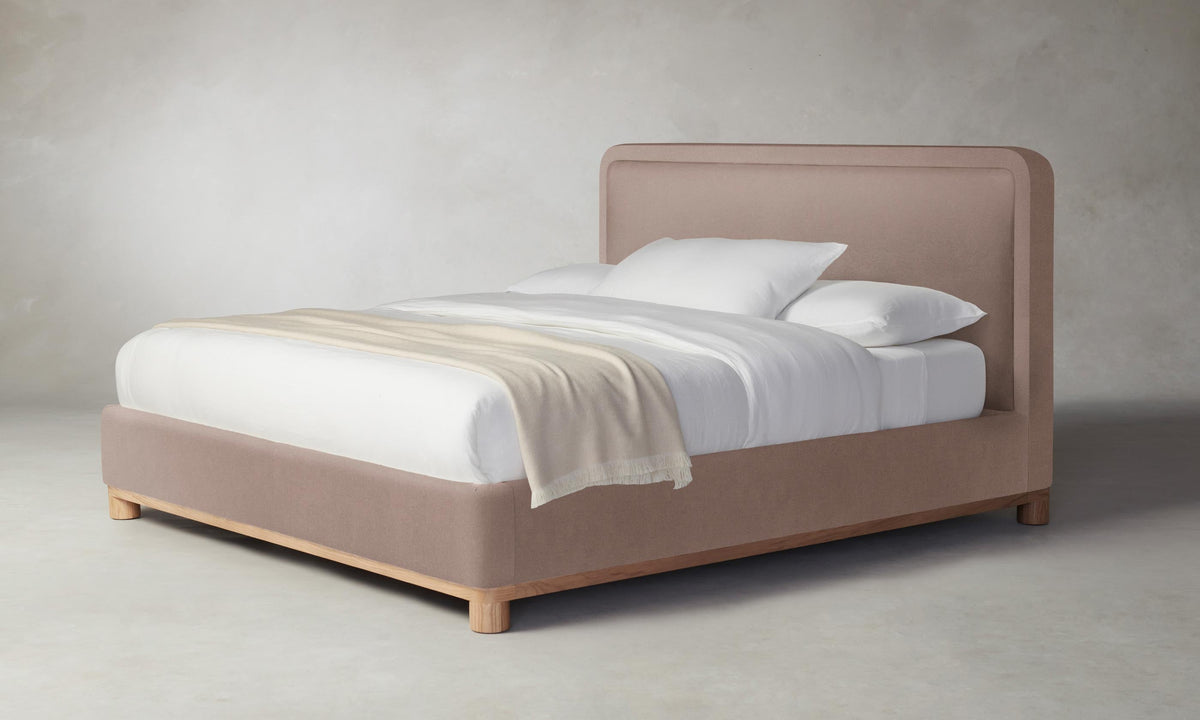 The Kent Bed’s rounded geometries create a sense of softness and tranquility. The design is tightly upholstered to emphasize its curved corners and foot rail, and it sits atop a plinth base with lathe-turned legs. Handcrafted in North Carolina.