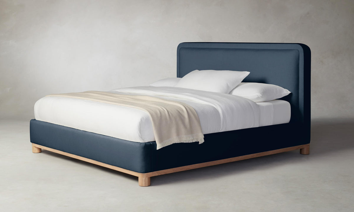 The Kent Bed’s rounded geometries create a sense of softness and tranquility. The design is tightly upholstered to emphasize its curved corners and foot rail, and it sits atop a plinth base with lathe-turned legs. Handcrafted in North Carolina.