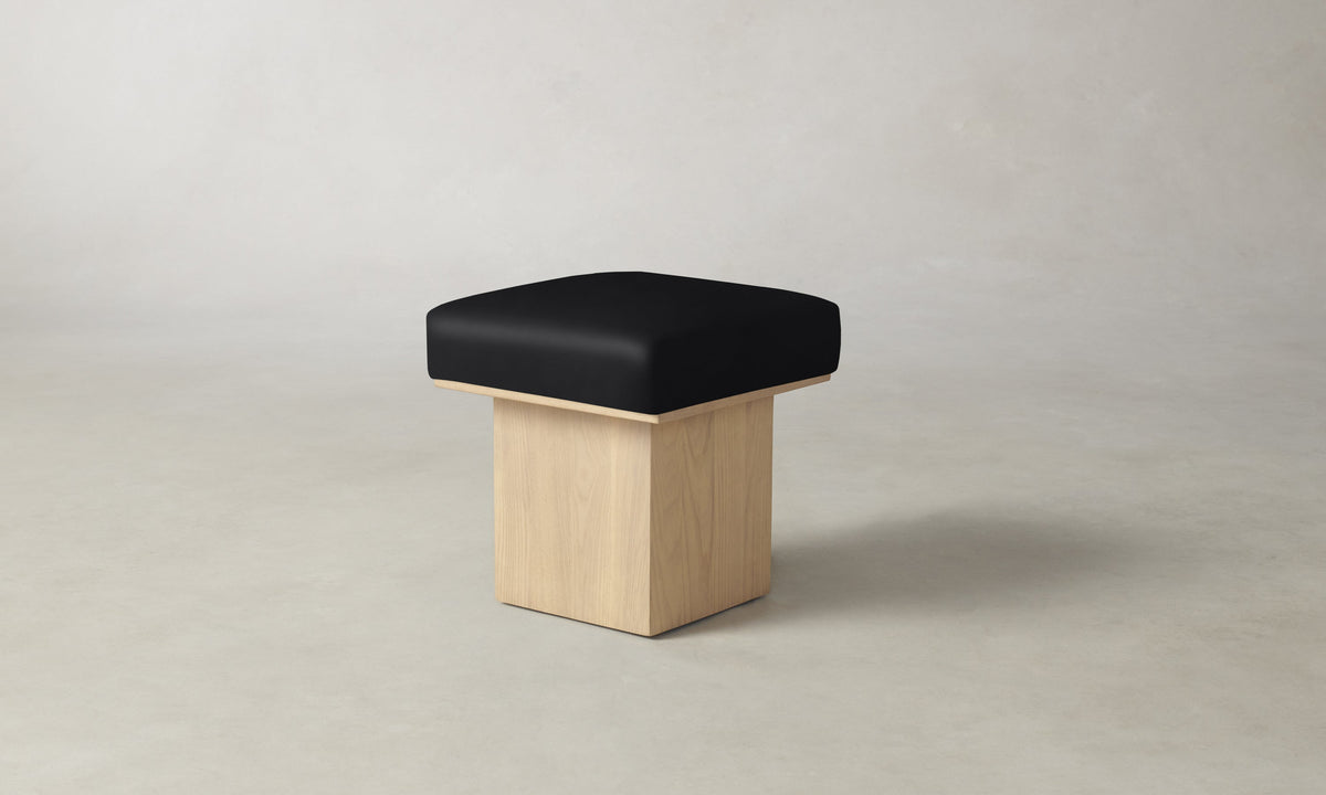 The Mulberry Ottoman's geometric silhouette exudes sophistication. It has a masterfully upholstered seat cushion that sits atop a striking ash pedestal base. Handcrafted in North Carolina.