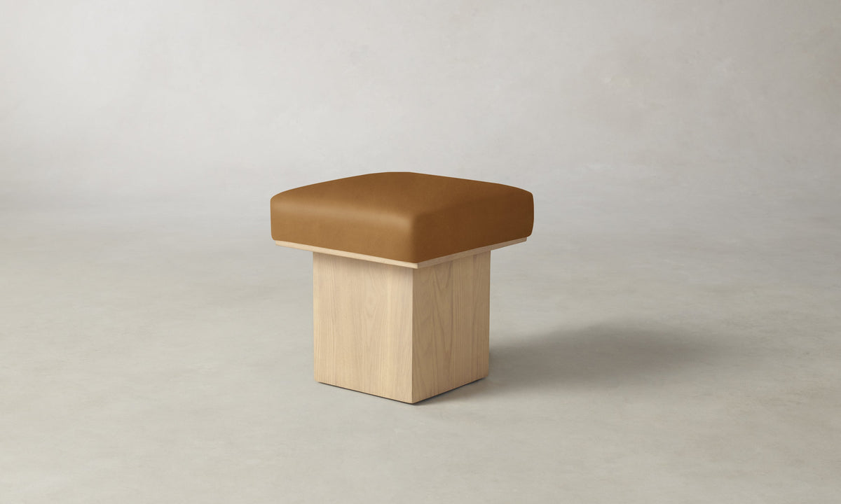 The Mulberry Ottoman's geometric silhouette exudes sophistication. It has a masterfully upholstered seat cushion that sits atop a striking ash pedestal base. Handcrafted in North Carolina.