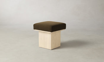 The Mulberry Ottoman's geometric silhouette exudes sophistication. It has a masterfully upholstered seat cushion that sits atop a striking ash pedestal base. Handcrafted in North Carolina.