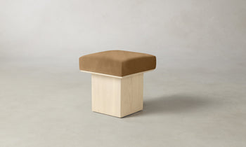 The Mulberry Ottoman's geometric silhouette exudes sophistication. It has a masterfully upholstered seat cushion that sits atop a striking ash pedestal base. Handcrafted in North Carolina.