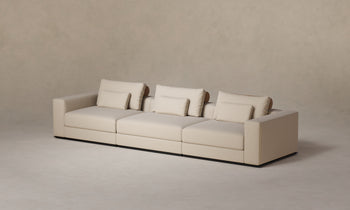 Marrying Italian modernist form with enveloping comfort, the Nicola Modular Sofa invites total relaxation, whether configured in a compact or expansive composition. It has a low back with plush down cushions supported by bolsters and rests atop a sleek plinth base. Handcrafted in North Carolina.