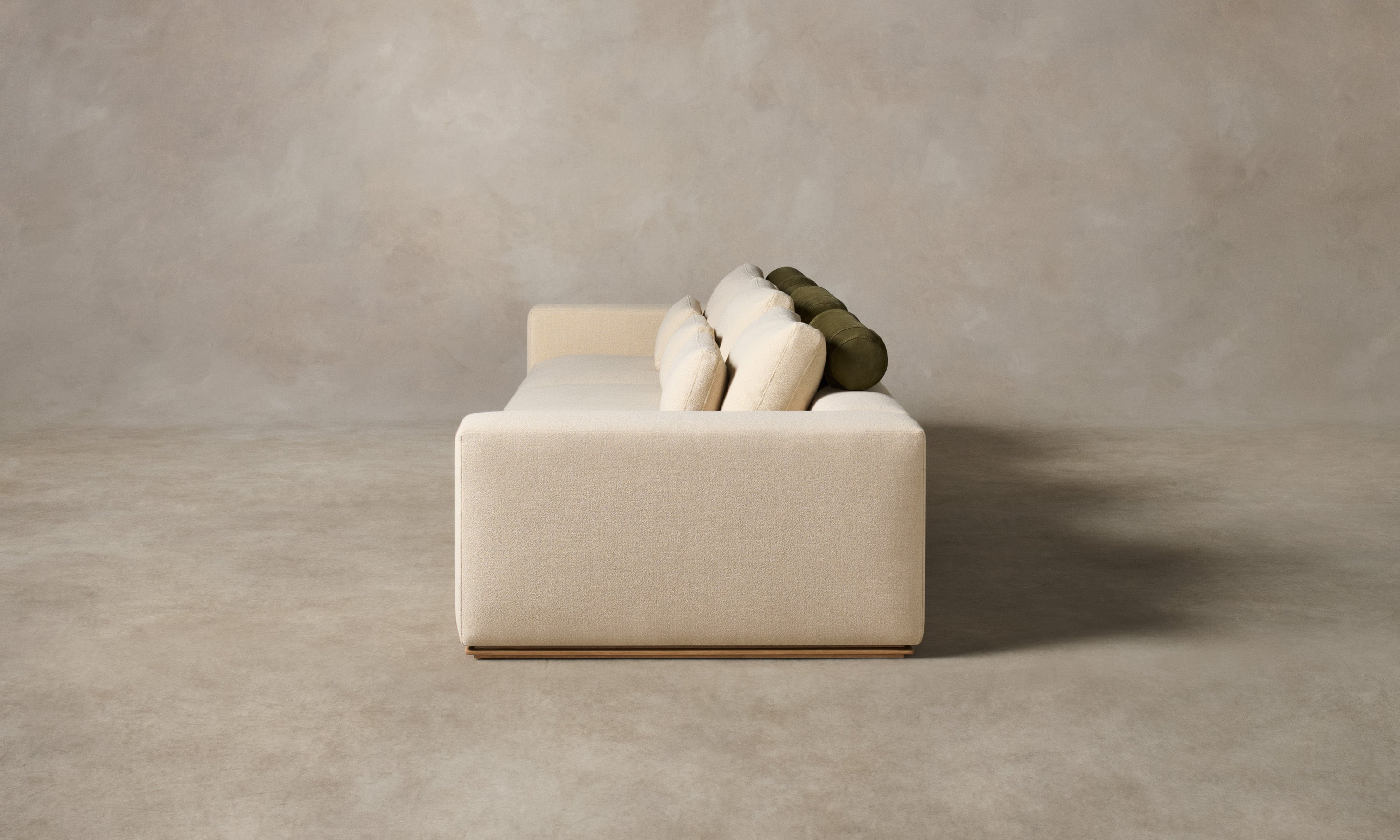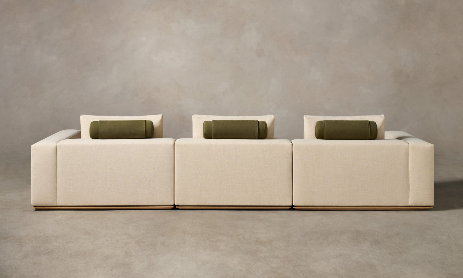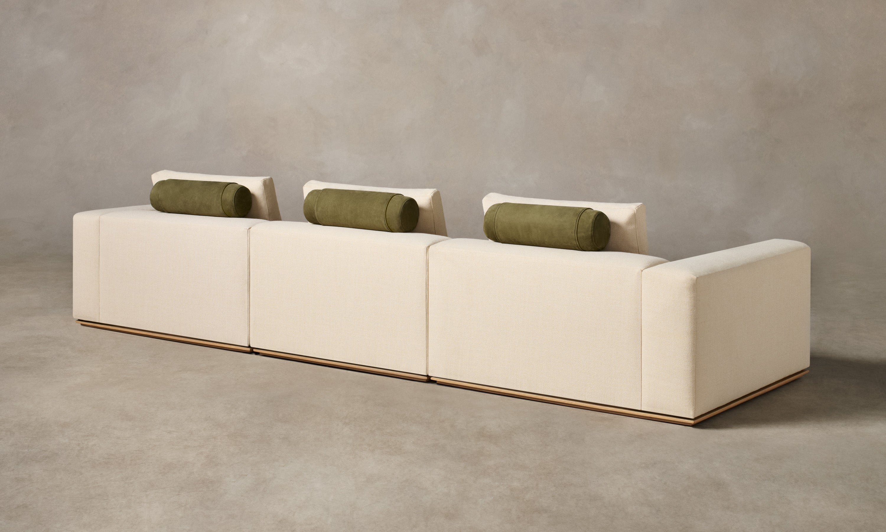 Marrying Italian modernist form with enveloping comfort, the Nicola Modular Sofa invites total relaxation, whether configured in a compact or expansive composition. It has a low back with plush down cushions supported by bolsters and rests atop a sleek plinth base. Handcrafted in North Carolina.