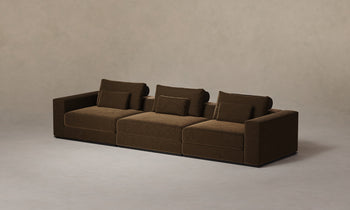 Marrying Italian modernist form with enveloping comfort, the Nicola Modular Sofa invites total relaxation, whether configured in a compact or expansive composition. It has a low back with plush down cushions supported by bolsters and rests atop a sleek plinth base. Handcrafted in North Carolina.