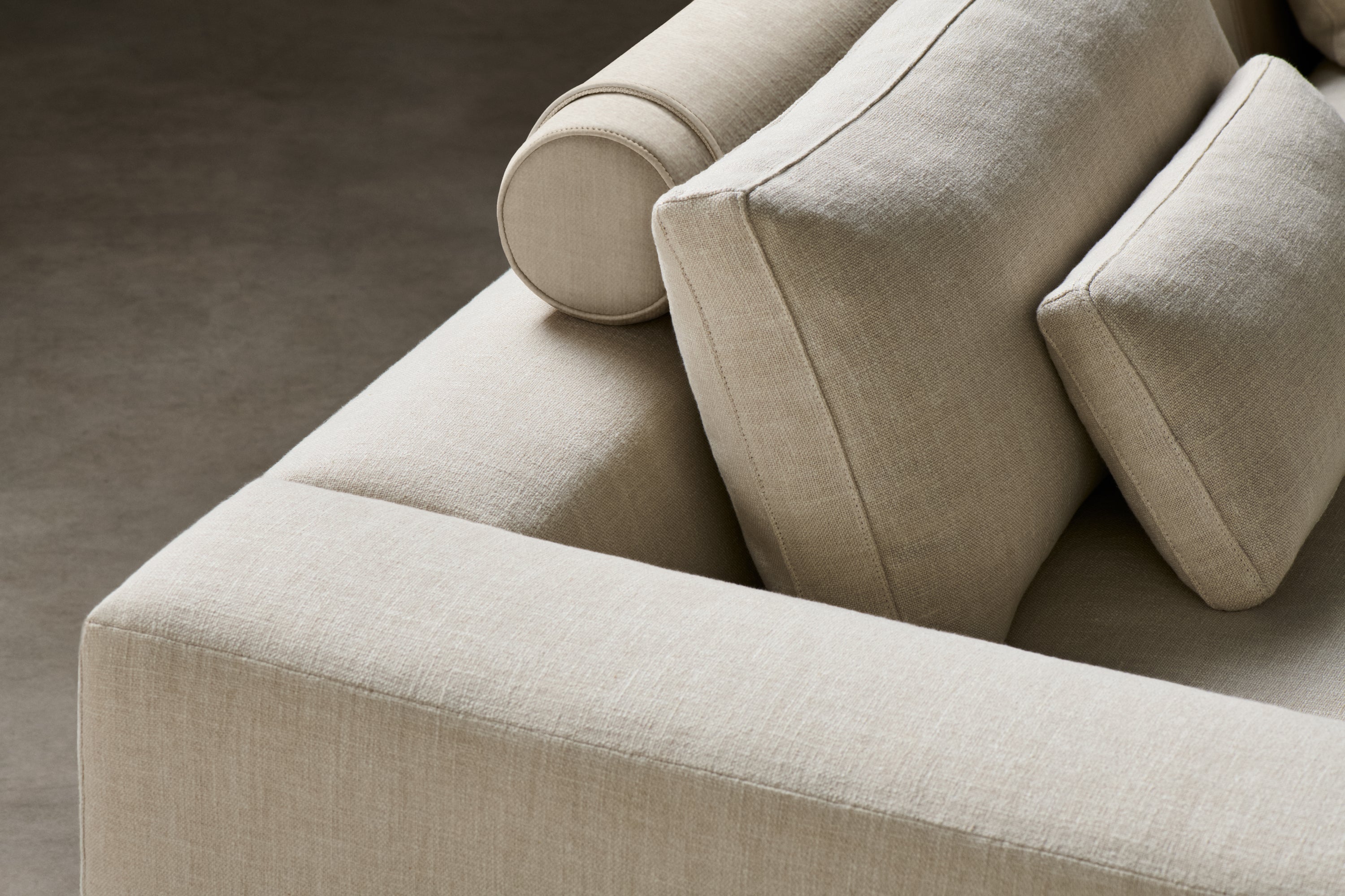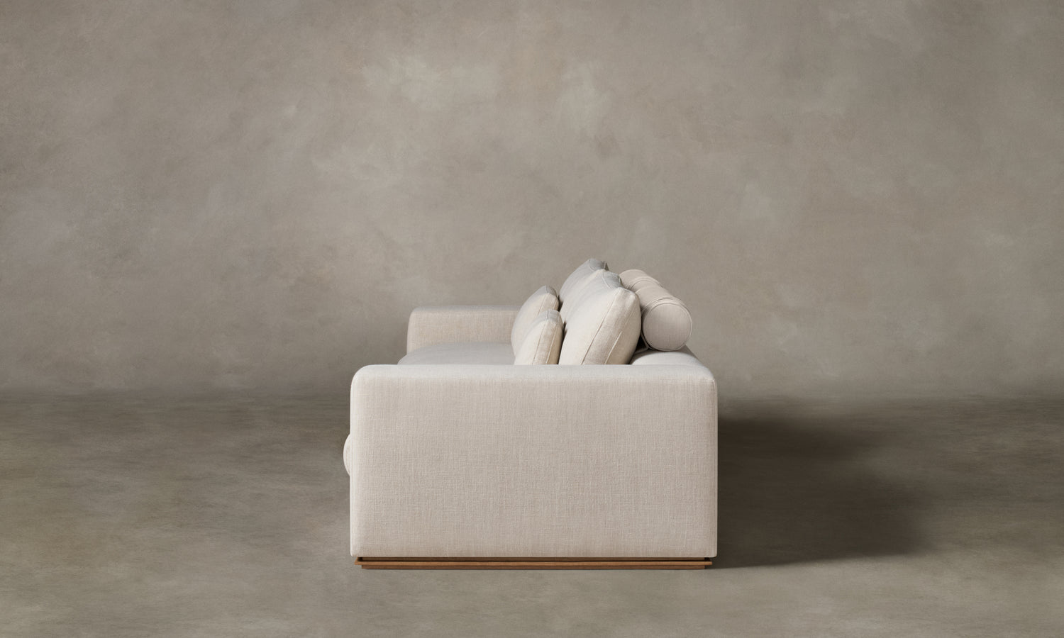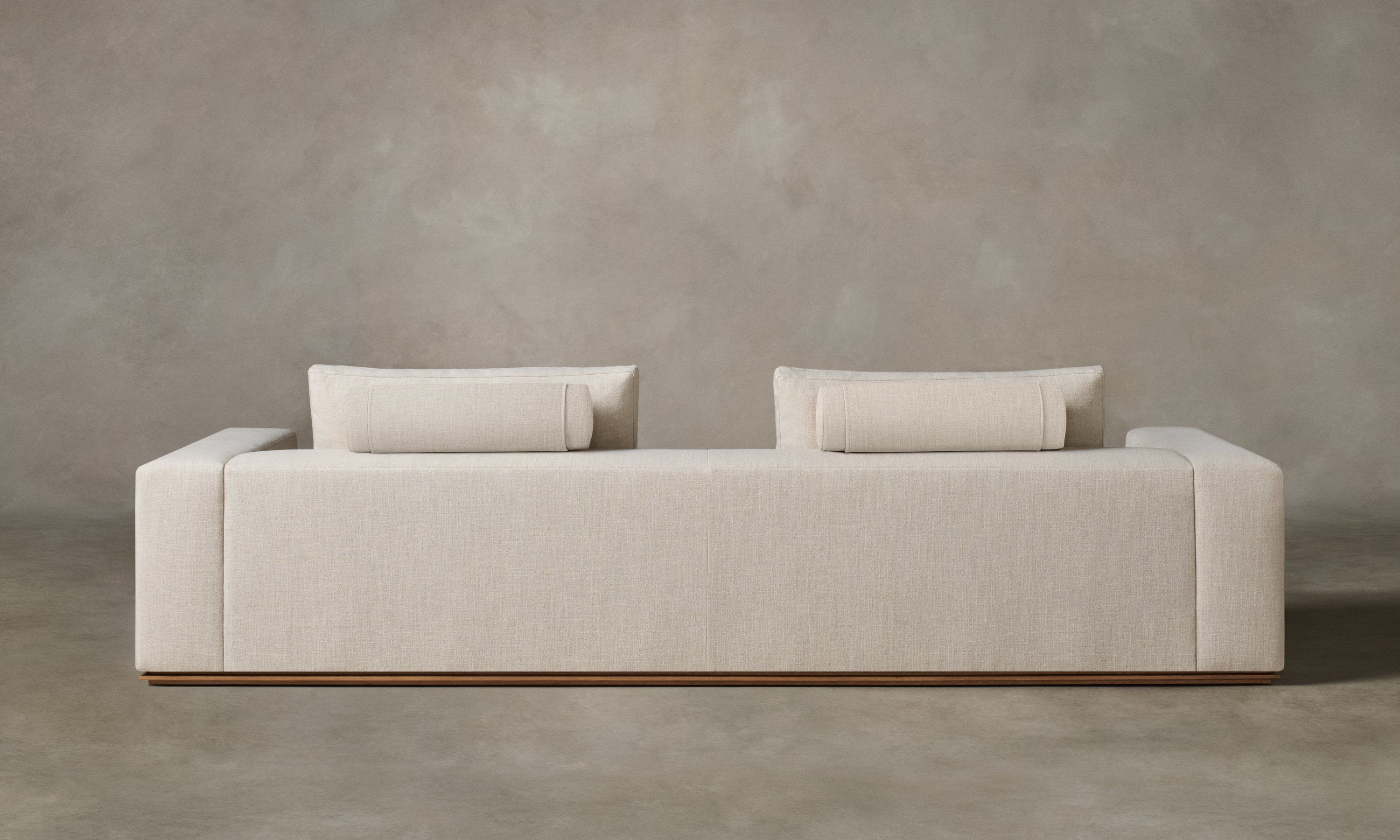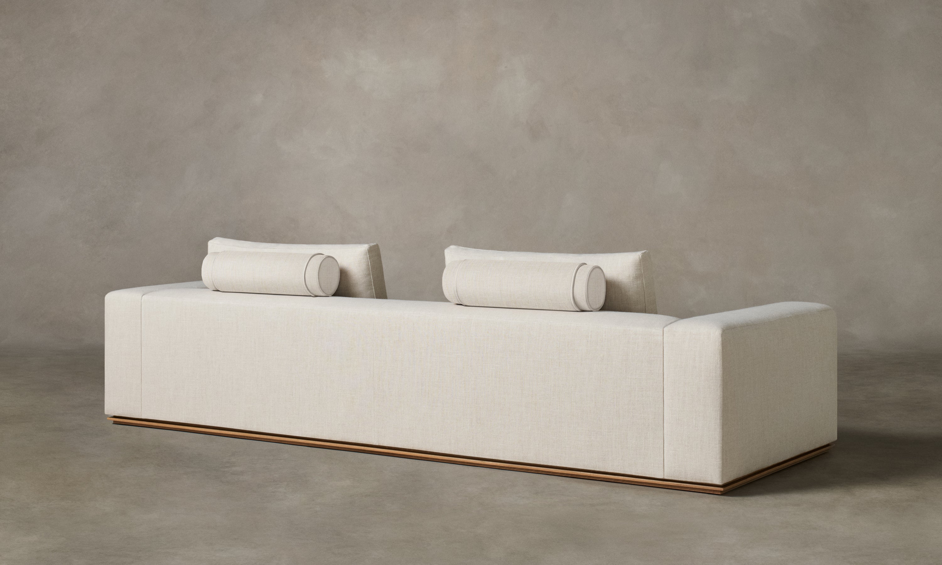 Marrying Italian modernist form with enveloping comfort, the Nicola Sofa invites total relaxation. It has a low back with plush down cushions supported by bolsters and rests atop a sleek plinth base. Handcrafted in North Carolina.