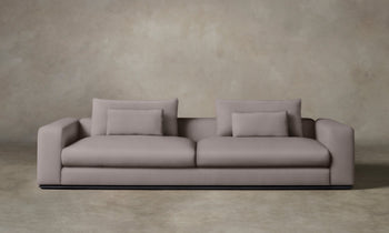 Marrying Italian modernist form with enveloping comfort, the Nicola Sofa invites total relaxation. It has a low back with plush down cushions supported by bolsters and rests atop a sleek plinth base. Handcrafted in North Carolina.