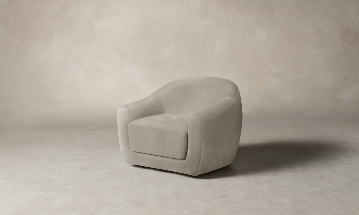 The Oliver Swivel Chair is soft and inviting in form. Its sloped wraparound arms extend an invitation to sit while its deep seat envelops the body in plush cushioning. Handcrafted in North Carolina.