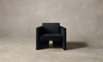 The Separa Chair is an architectural statement piece defined by a dramatic split at the back. It has wraparound arms and a waterfall seat complete with tight upholstery. Handcrafted in North Carolina.
