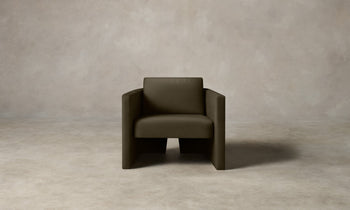 The Separa Chair is an architectural statement piece defined by a dramatic split at the back. It has wraparound arms and a waterfall seat complete with tight upholstery. Handcrafted in North Carolina.