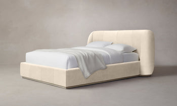 With its voluminous form and sweeping curves, the Smith Bed is a statement piece for the bedroom. Its enveloping shelter headboard and frame are fully upholstered and set upon a plinth base. Handcrafted in North Carolina.
