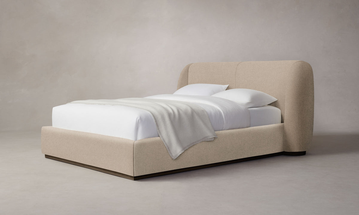 With its voluminous form and sweeping curves, the Smith Bed is a statement piece for the bedroom. Its enveloping shelter headboard and frame are fully upholstered and set upon a plinth base. Handcrafted in North Carolina.